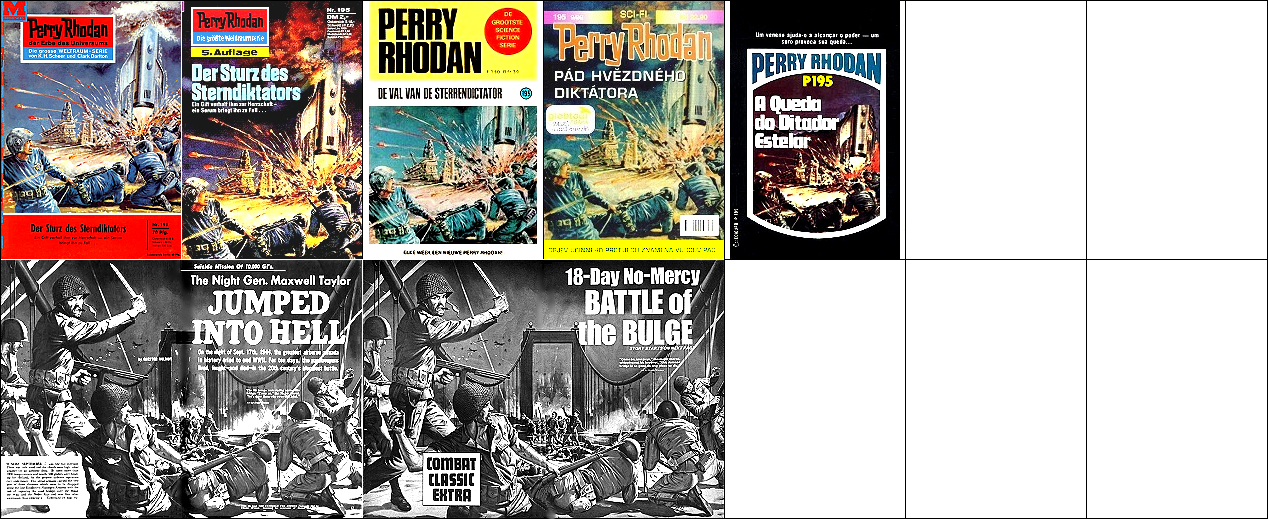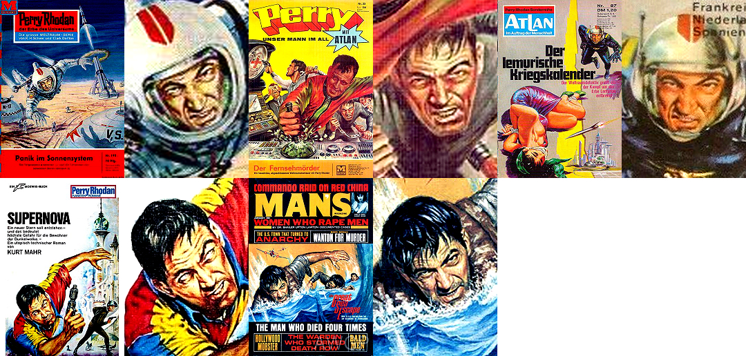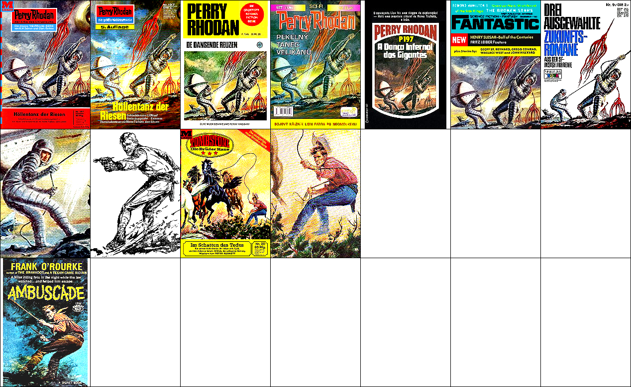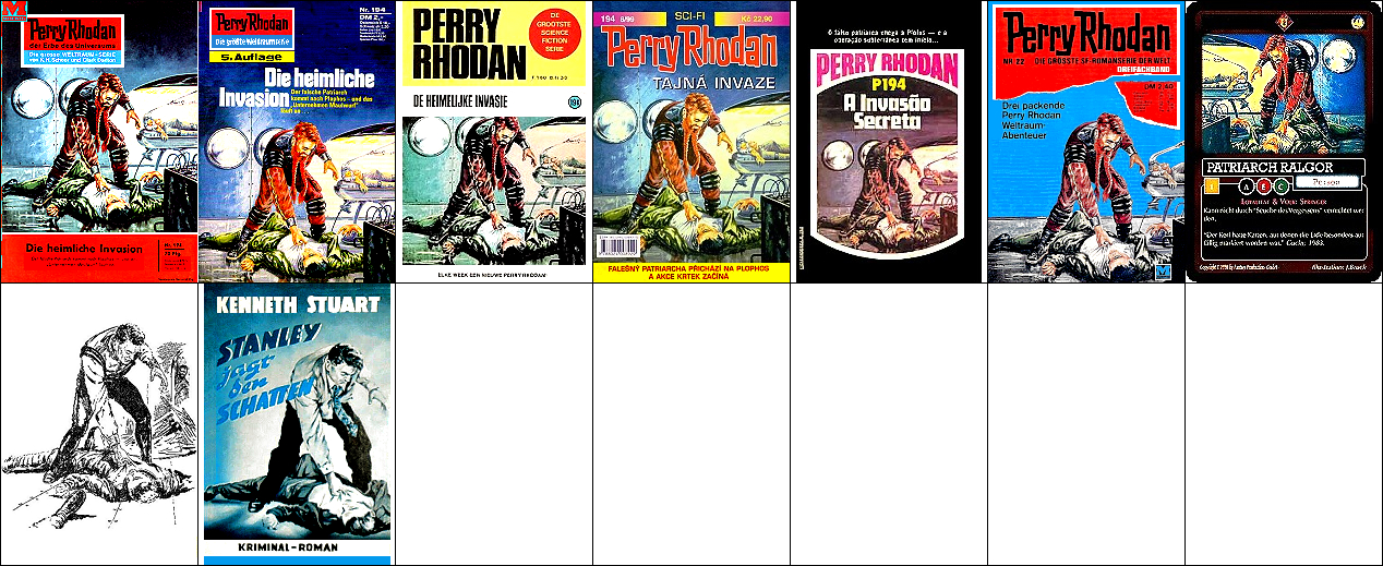 sehr ähnliches Motiv, 1 - 7 gleiches Bild, Nachauflagen mit verändertem Hintergrund, in 2 wurde das Titelbild für den falschen Roman verwendet, 8 - 13, 14 - 15 gleiches Bild, 15 mit überarbeitetem Hintergrund, 17 ist Vorbild für Nachzeichnungen |