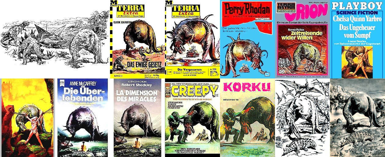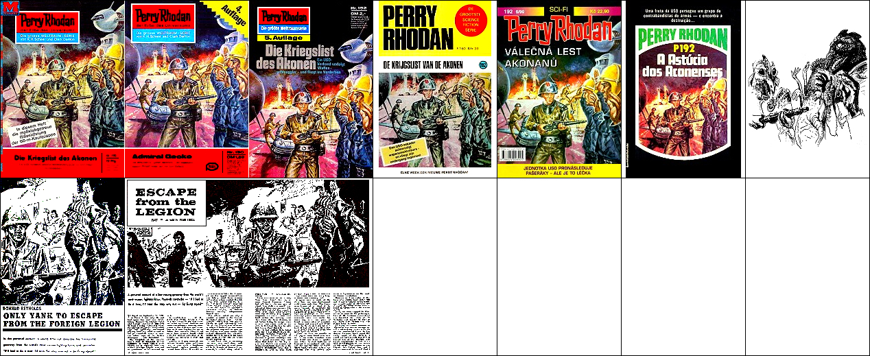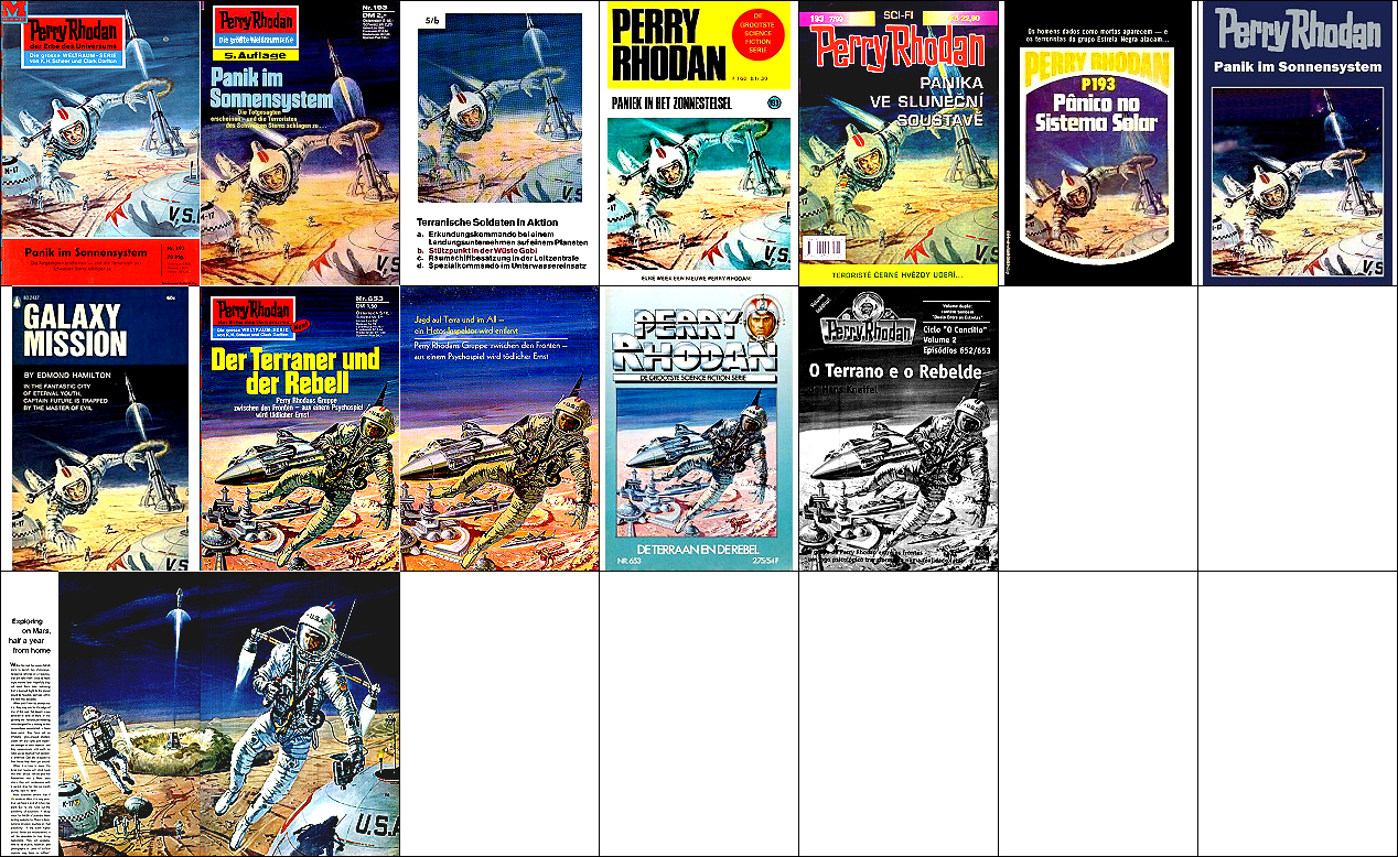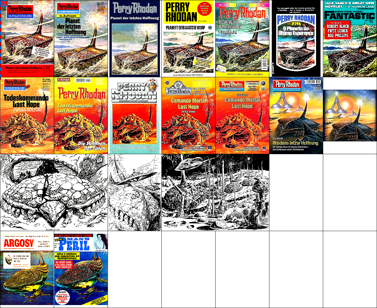 sehr ähnliches Motiv, 1 - 7 gleiches Bild, Nachauflagen mit verändertem Hintergrund, in 2 wurde das Titelbild für den falschen Roman verwendet, 8 - 13, 14 - 15 gleiches Bild, 15 mit überarbeitetem Hintergrund, 17 ist Vorbild für Nachzeichnungen |