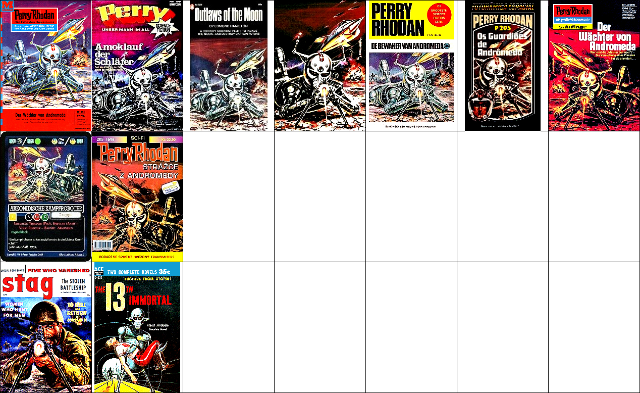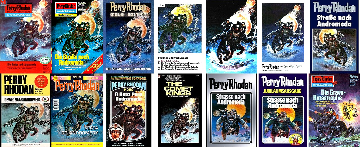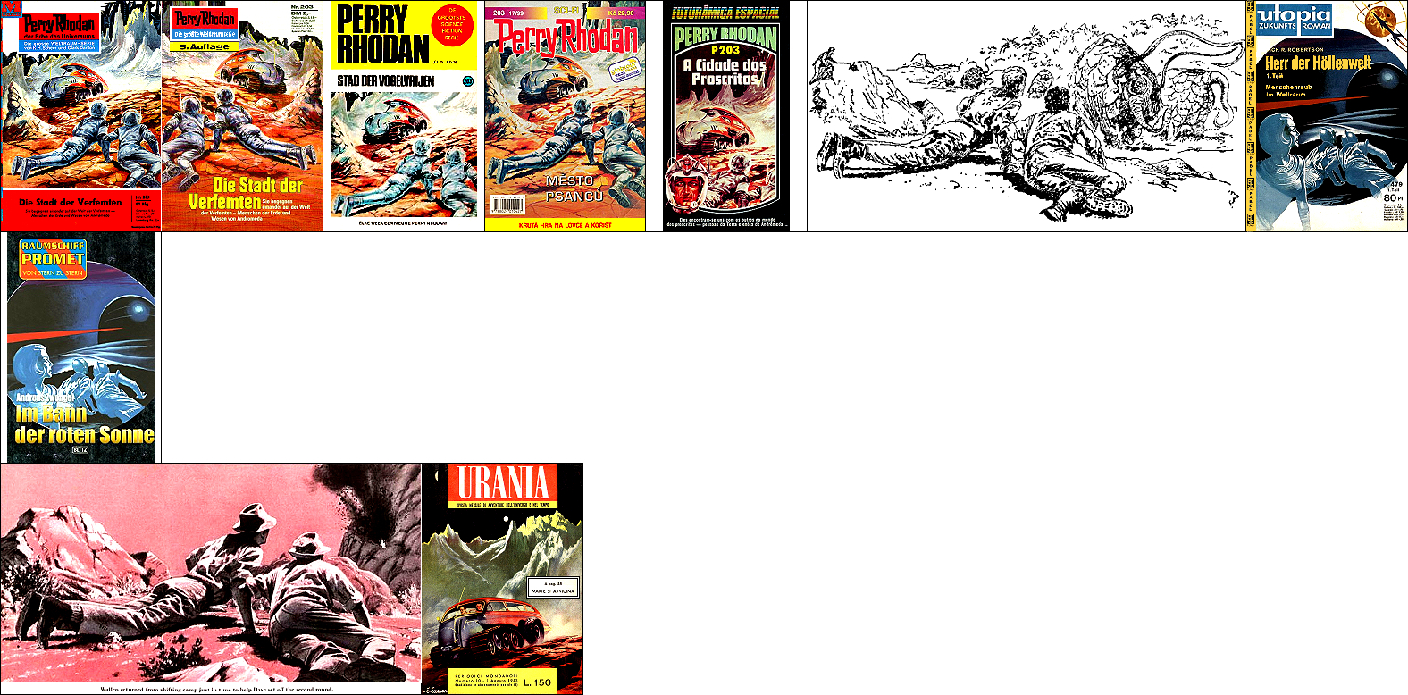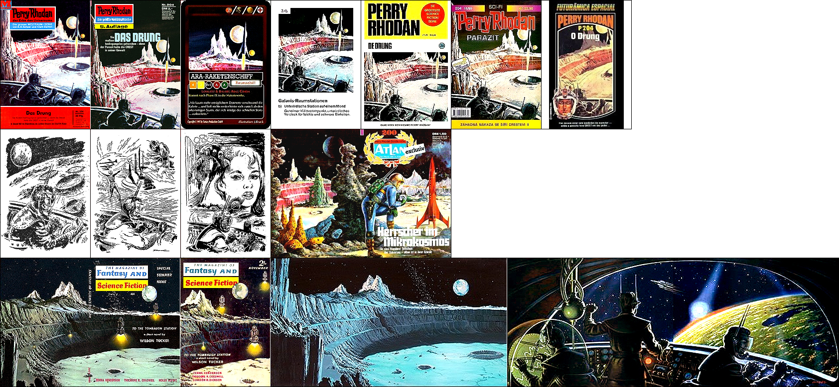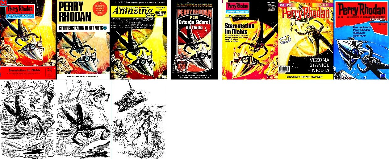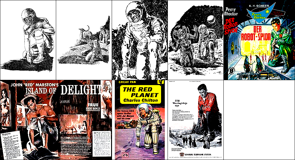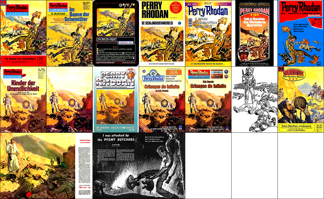 1 - 7 gleiches Bild, 7 seitenverkehrt mit überarbeitetem Hintergrund, 8 - 12 gleiches Bild, gleicher Hintergrund wie in 1 und auch der liegende Mann ist vorhanden, der findet sich auch in 13 wieder, in 14 wird ein ähnlicher Bildhintergrund gezeigt, 15 ist das Vorbild inkl. des liegenden Mannes, wobei in 8 das ganze Bild übernommen und nur der stehende Mann übermalt und das Gestrüpp ergänzt sowie das Raumschiff hinzugefügt wurde, 16 ist das Vorbild für den Mann in 1, der gegen die Tierchen kämpft |