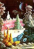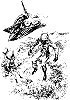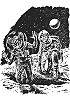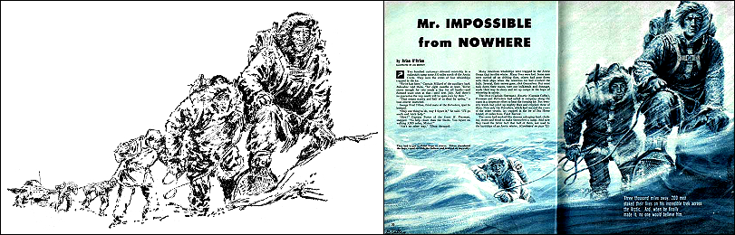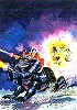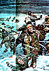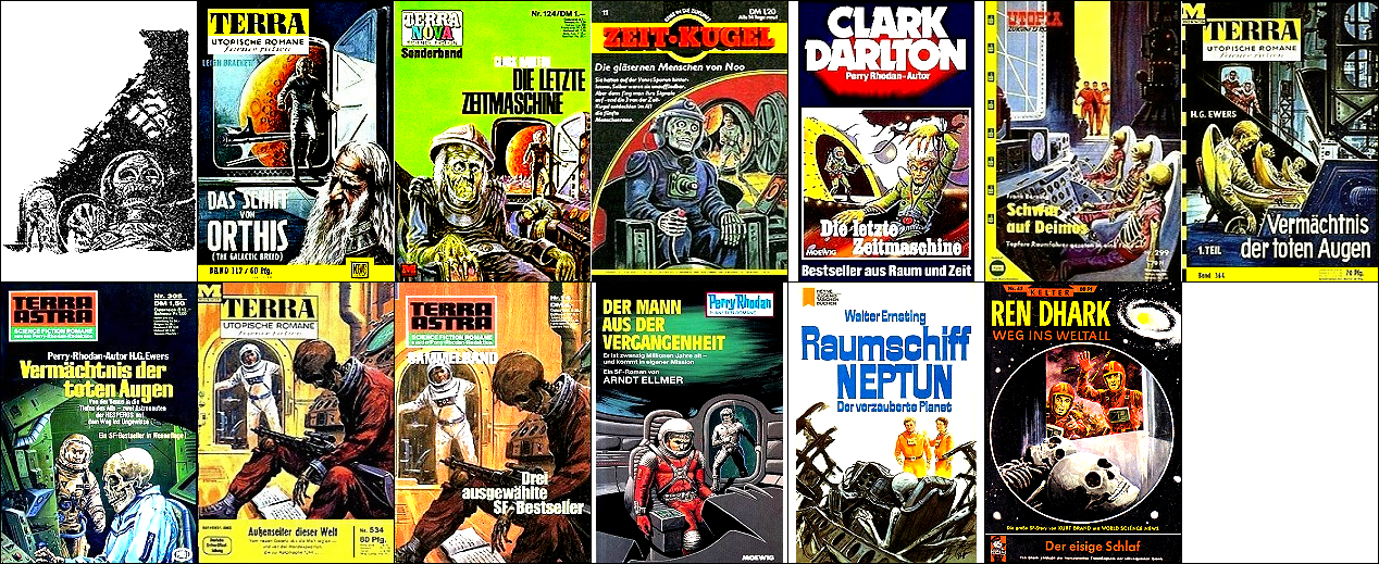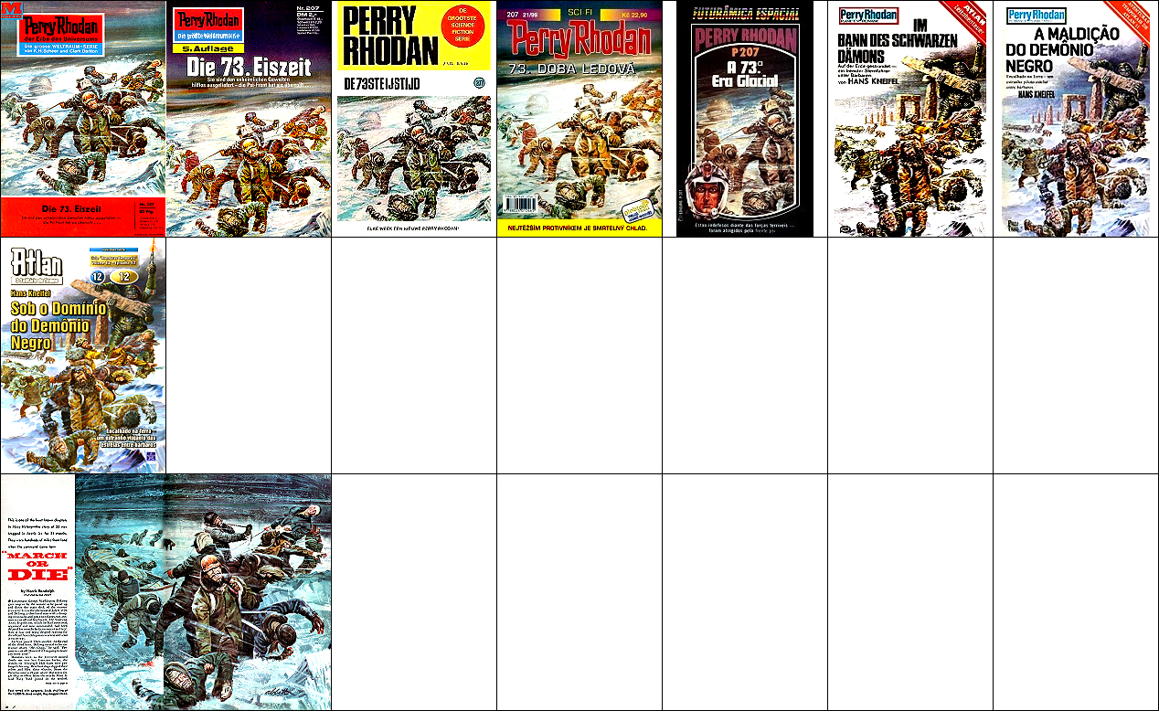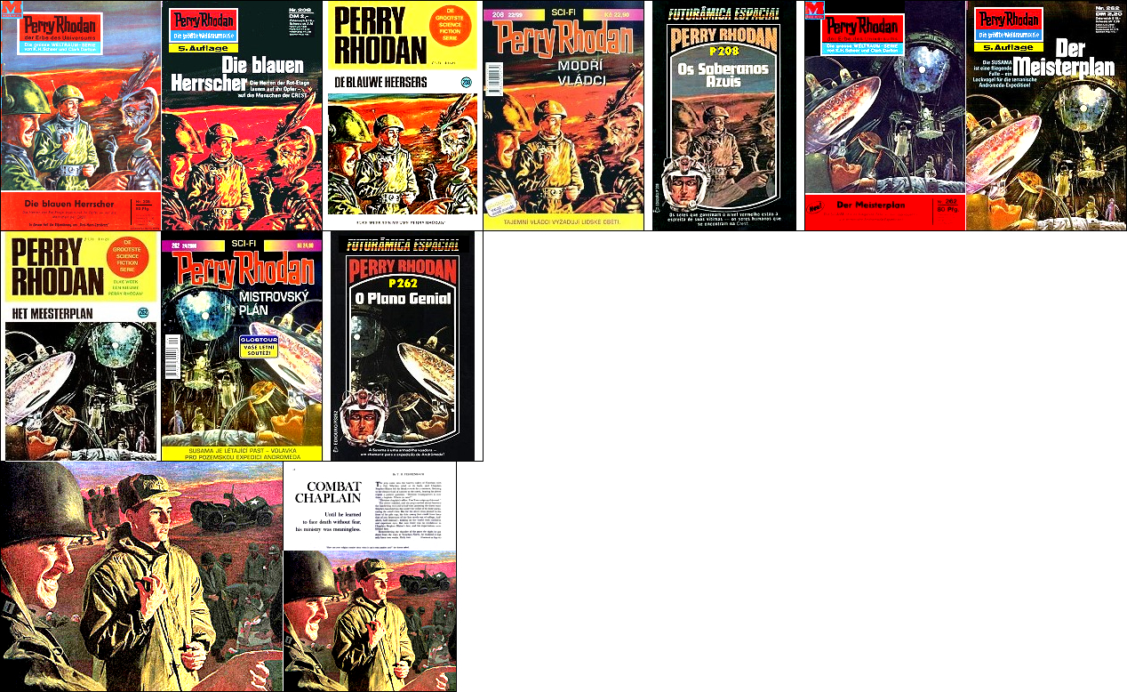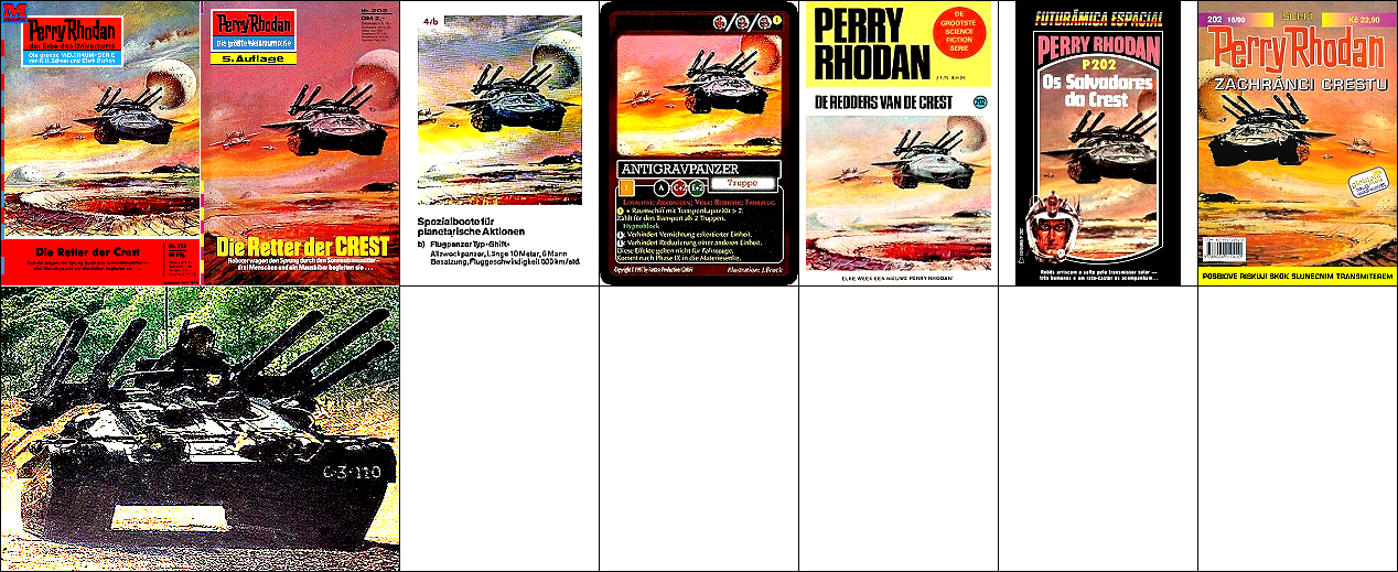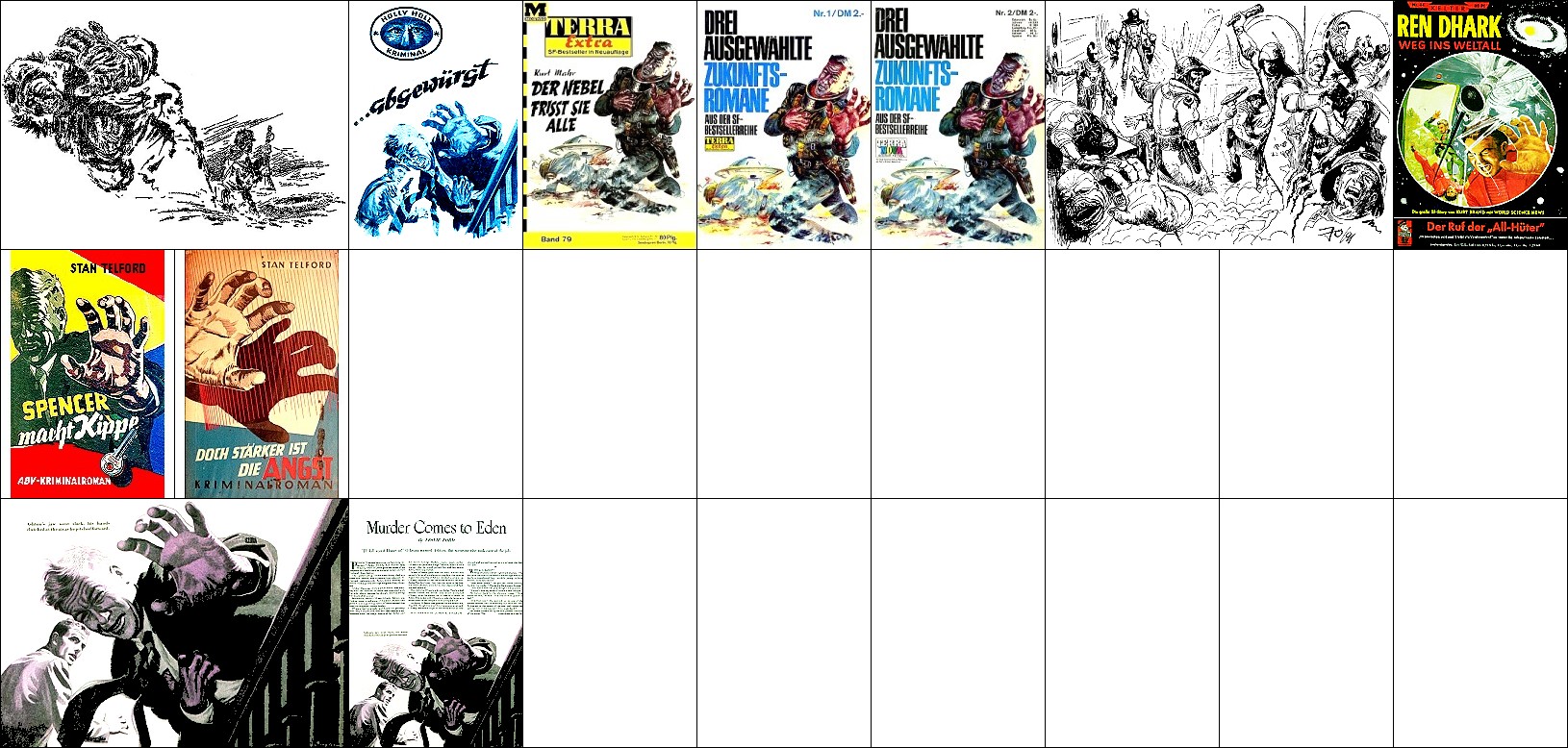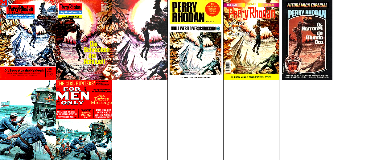 1 - 7 gleiches Bild, 7 seitenverkehrt mit überarbeitetem Hintergrund, 8 - 12 gleiches Bild, gleicher Hintergrund wie in 1 und auch der liegende Mann ist vorhanden, der findet sich auch in 13 wieder, in 14 wird ein ähnlicher Bildhintergrund gezeigt, 15 ist das Vorbild inkl. des liegenden Mannes, wobei in 8 das ganze Bild übernommen und nur der stehende Mann übermalt und das Gestrüpp ergänzt sowie das Raumschiff hinzugefügt wurde, 16 ist das Vorbild für den Mann in 1, der gegen die Tierchen kämpft |