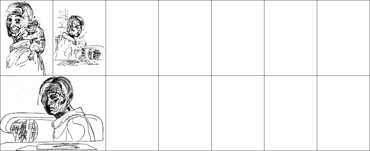 1 - 5, 6 - 10 gleiches Bild, 9 - 10 seitenverkehrt, in 2 Hintergrund fast schwarz eingefärbt. Kopf des Mannes von 1 und 6 als Collage von 15 übernommen |