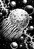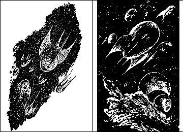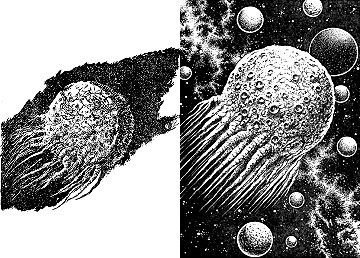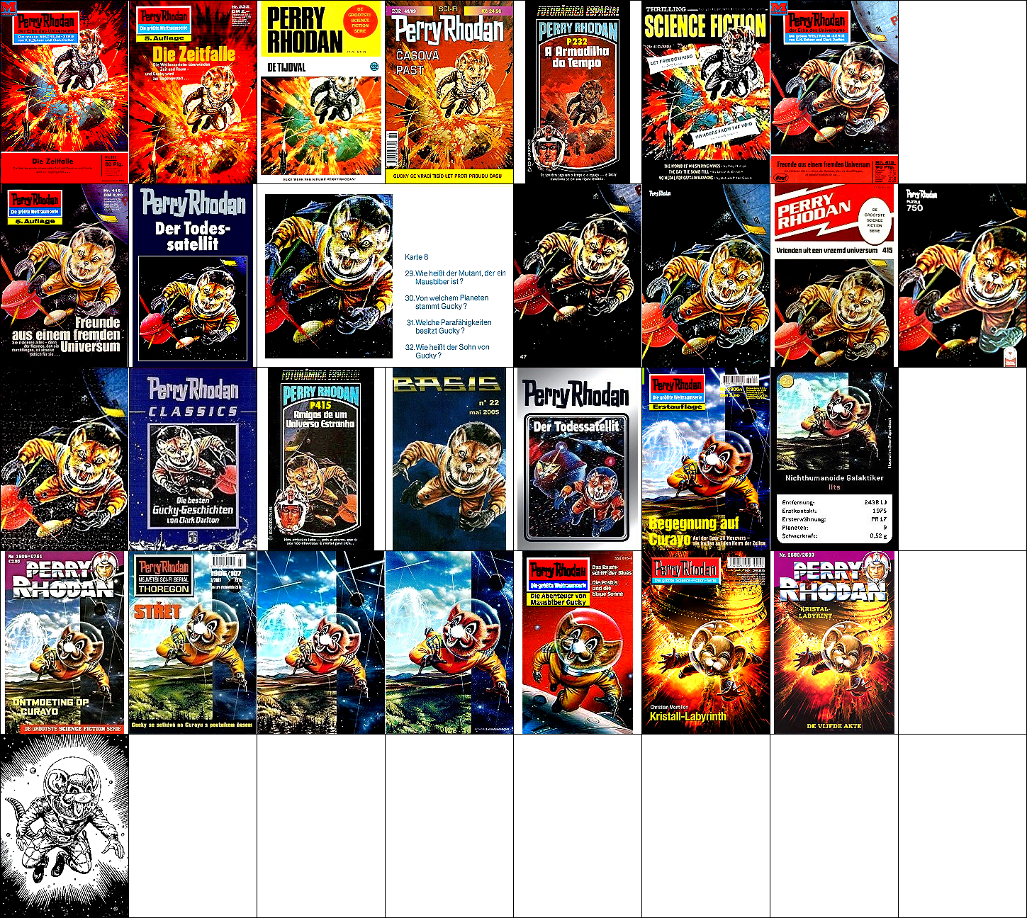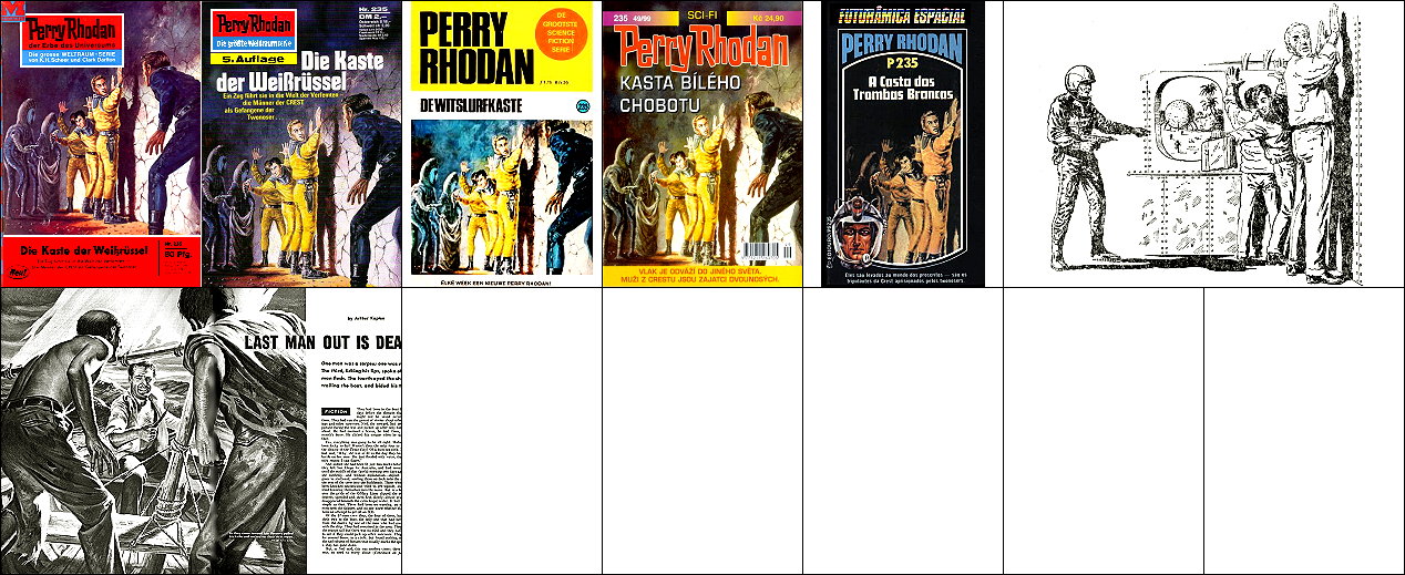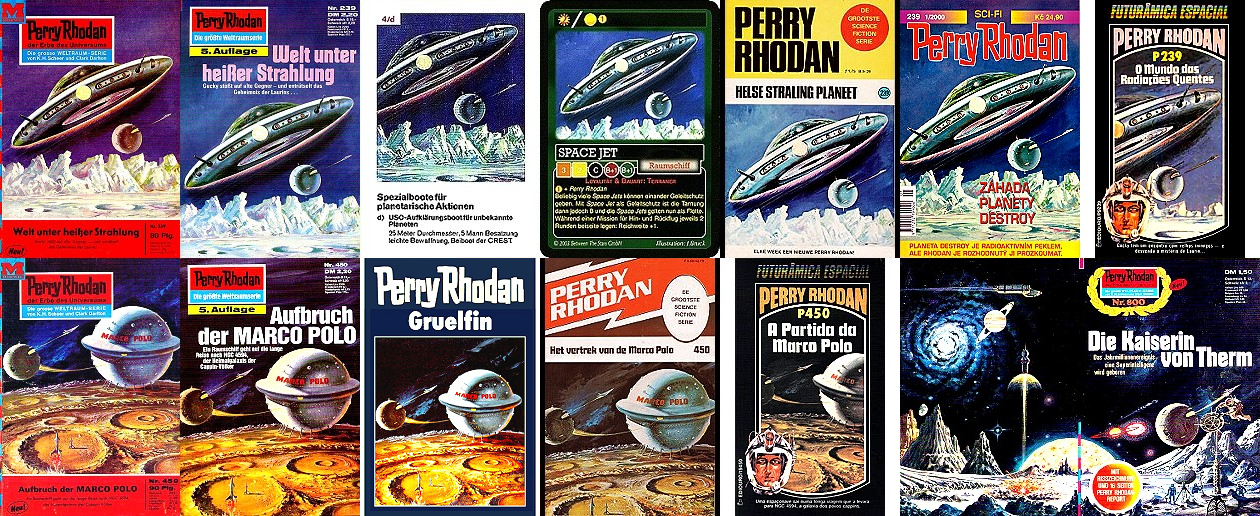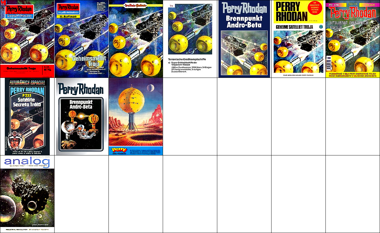 Raumschiff identisch, Hintergrund unterschiedlich, 1 - 7, 8 - 12, 13 - 22 gleiches Bild, 23 ist Vorbild für Nachzeichnungen des Kugelraumschiffes und Beibootes |