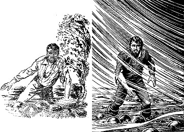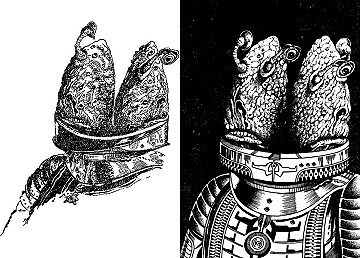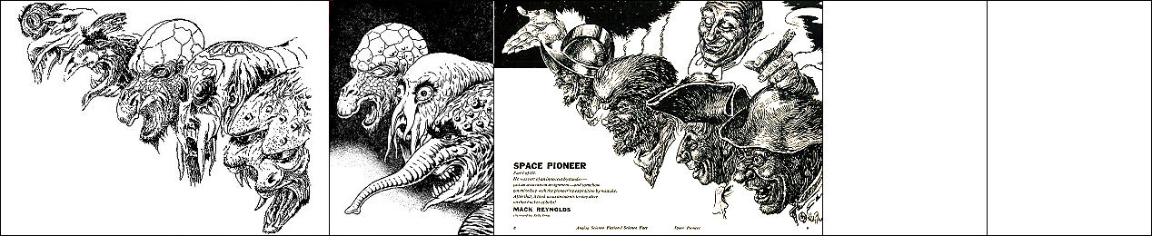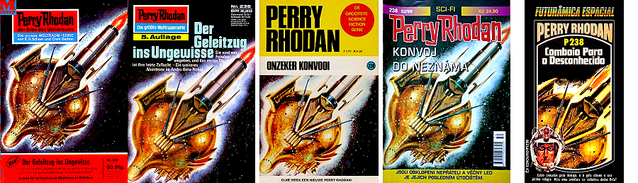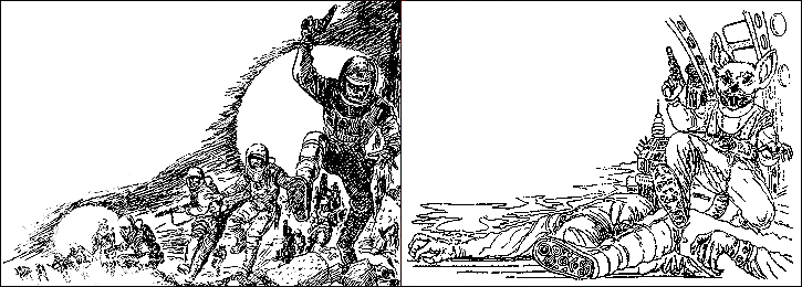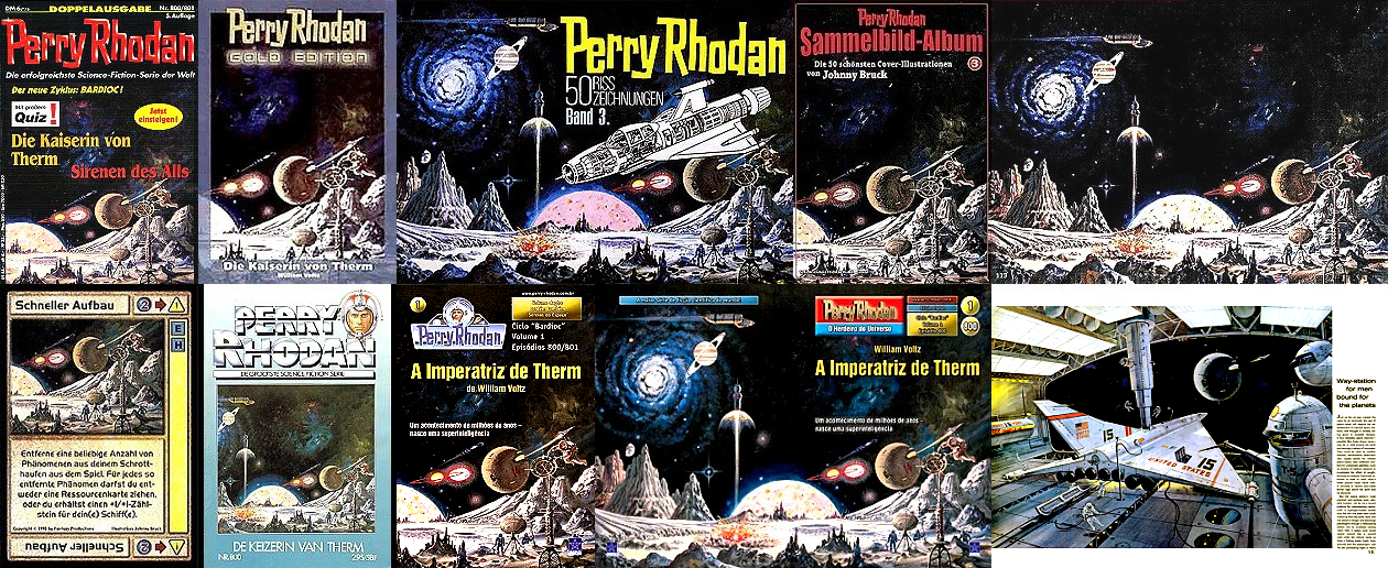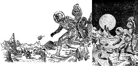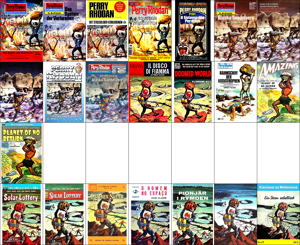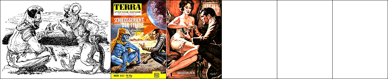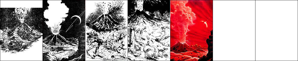Bild für Neuauflage nachempfunden, die aber im Detail von 5 nachgezeichnet ist (man beachte den Felsblock rechts und den Ringplaneten), 3 und 4 ähnliches Motiv |