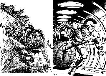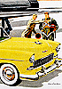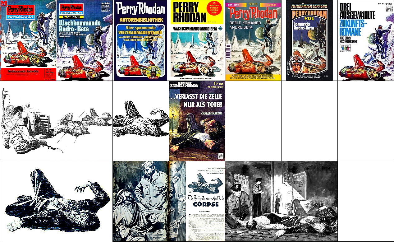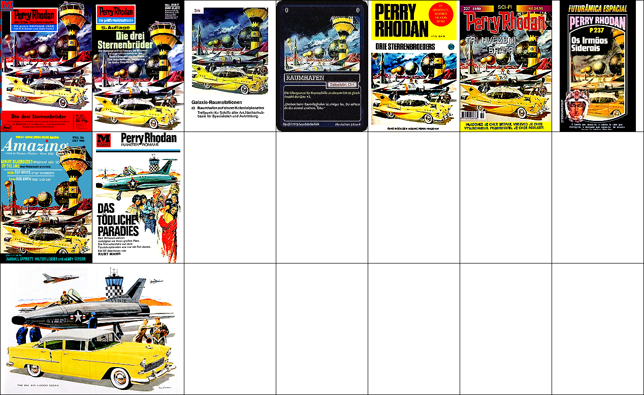 1 - 8 gleiches Bild, 8 mit überarbeitetem Hintergrund, eine ähnliches Jetflugzeug wie die Rakete hinter dem Auto findet sich auch in 9, dieses Bild hat genauso wie 1 die Szene aus 15 zum Vorbild |