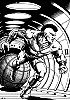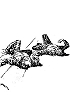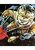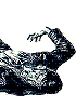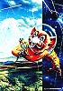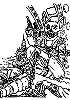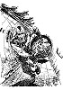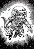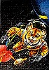 Raumfahrer bzw. Gucky springt mit erhobener Handwaffe über Hindernis nach vorn |