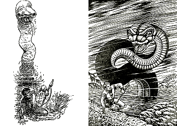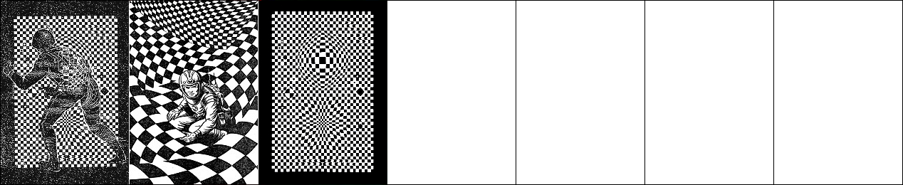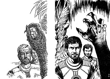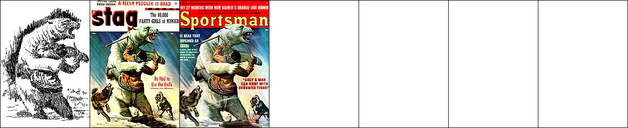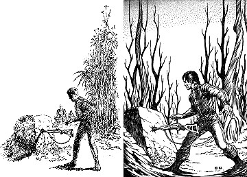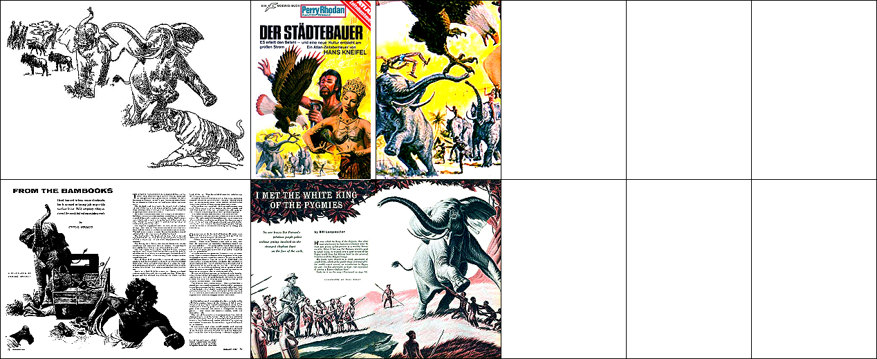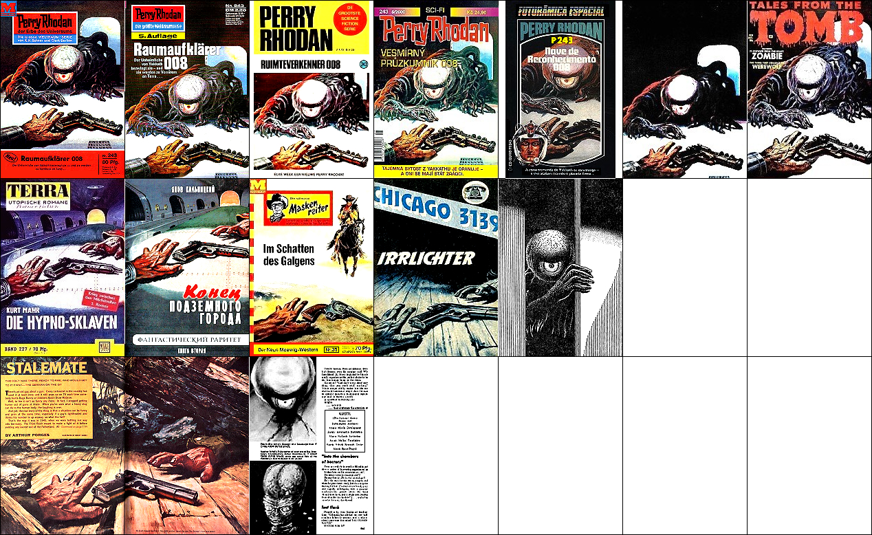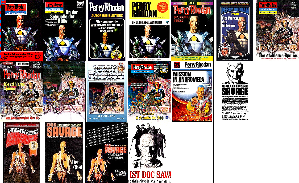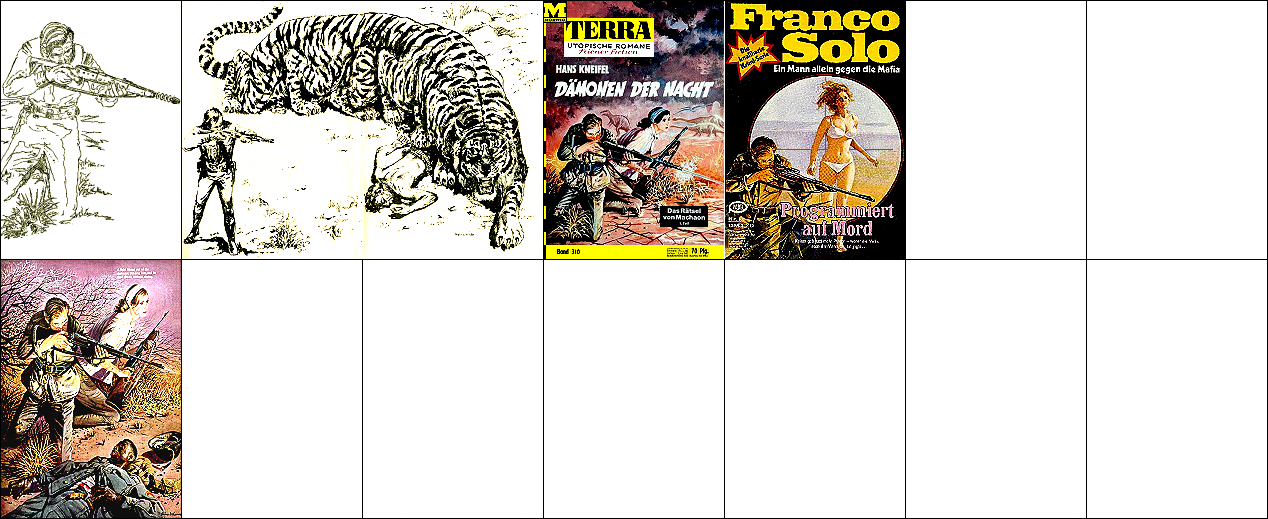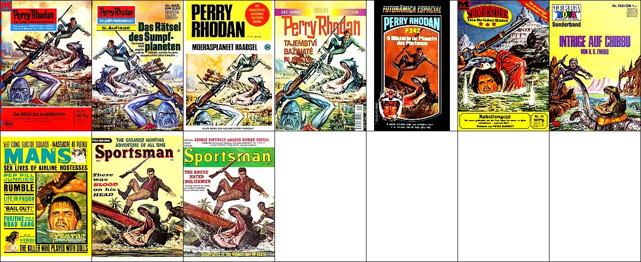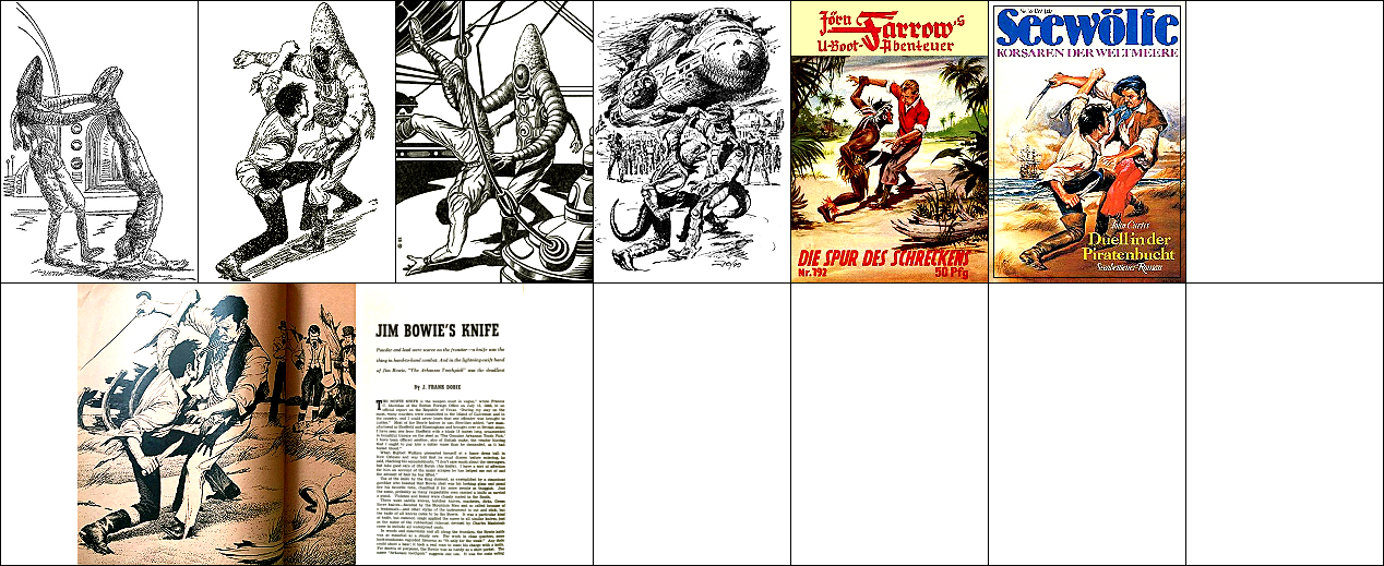 3 ist für Neuauflage von 1 und 2 nachgezeichnet und verwendet von 1 den mit dem Kopf nach unten hängenden Terraner und von 2 den Twonoser, in 4 und 5 haben die Kontrahenten die gleiche Körperhaltung wie in 2, 6 ist eine weitere Nachzeichnung, 8 ist Vorbild |