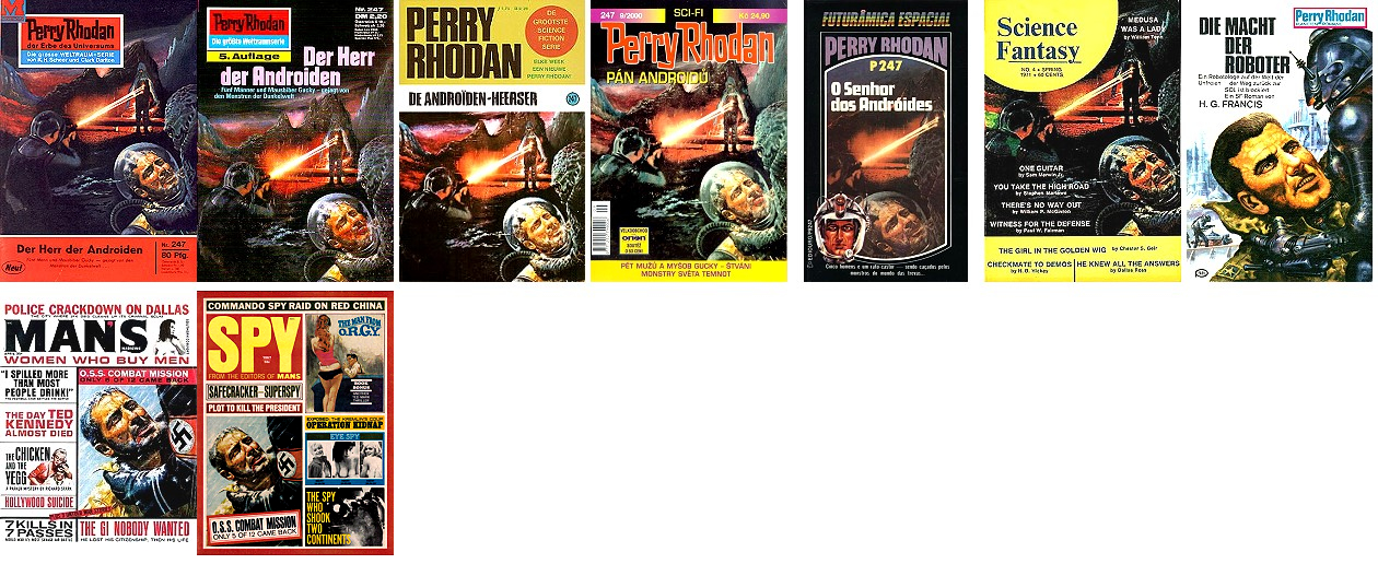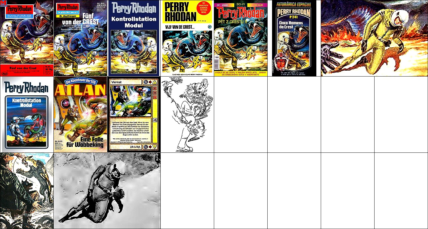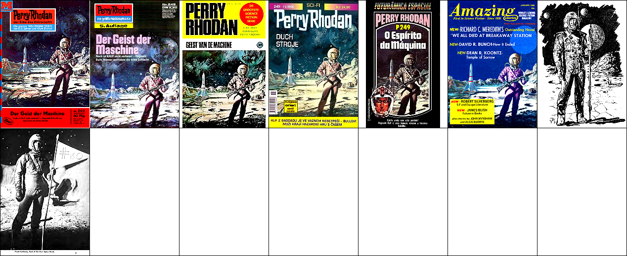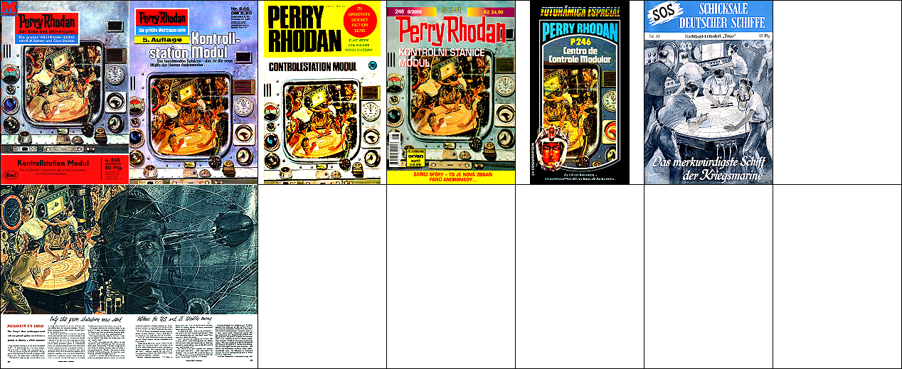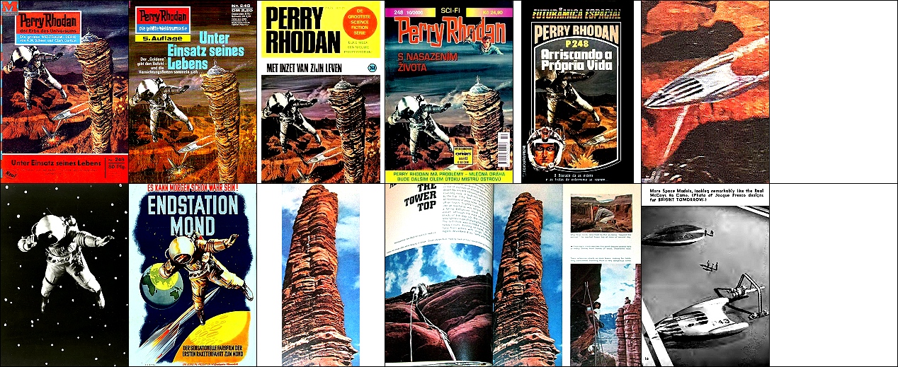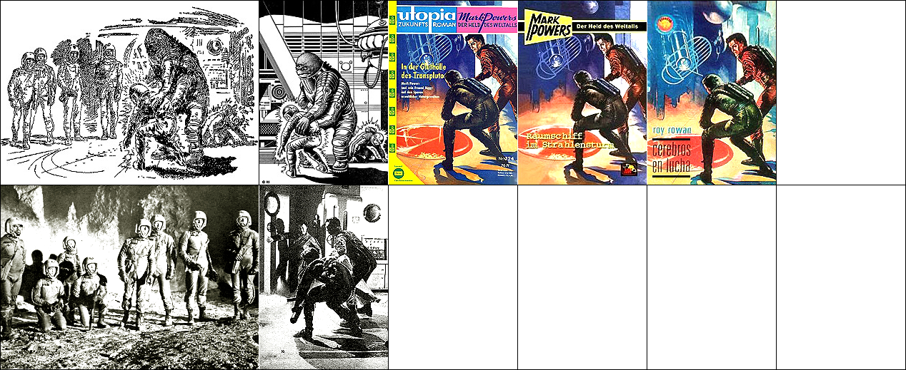 1 - 6 gleiches Bild, 5 Raumfahrer und Rakete zusammengerückt, 6 Hintergrund leicht bearbeitet, 7 ähnliches Motiv, 8 Vorbild für Nachzeichnungen |