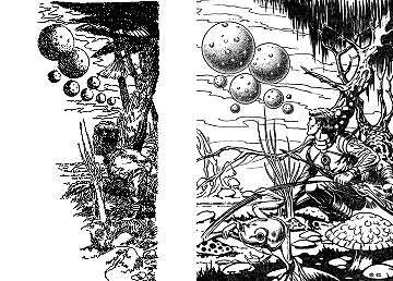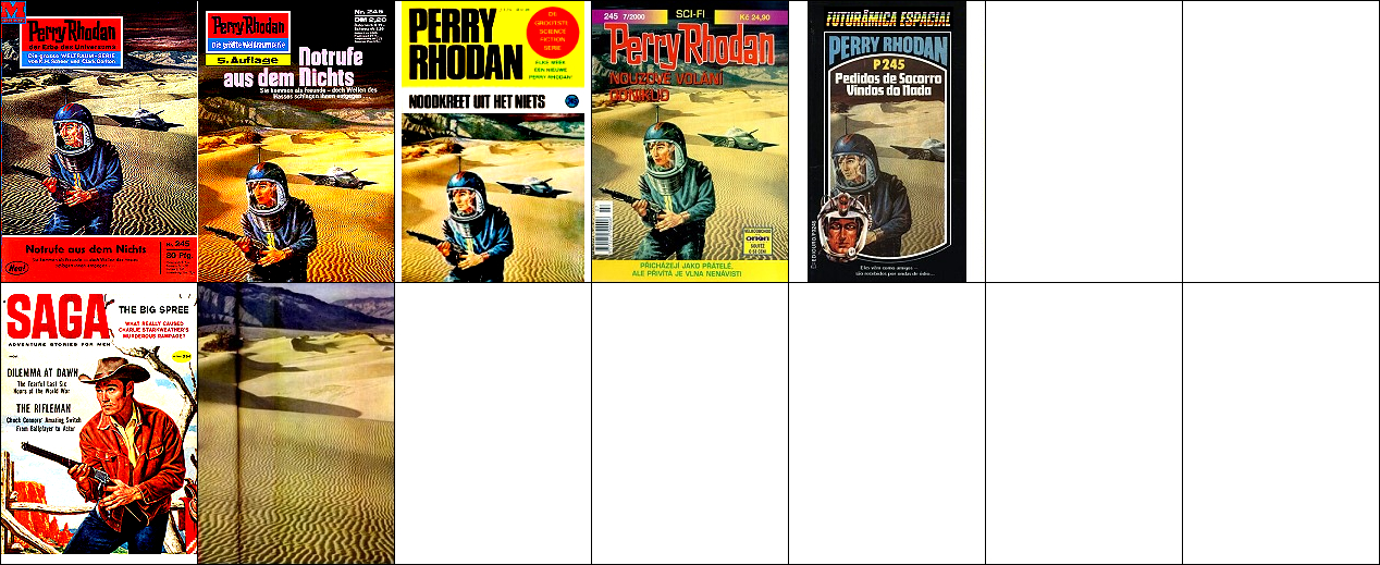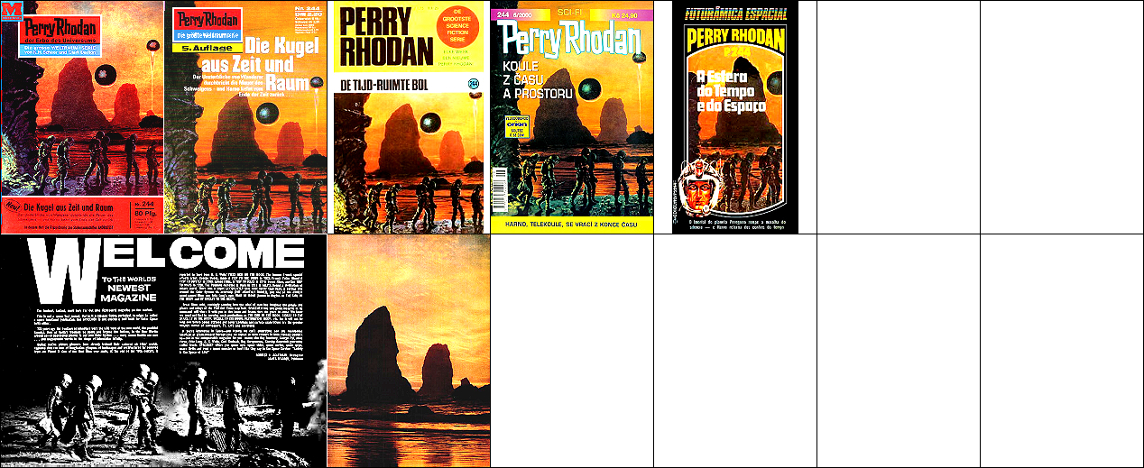 1 - 5 gleiches Bild, Raumfahrer aus 8 in 1 eingebaut, in 9 Zeichnung mit gleicher Körperhaltung, die Felssäule ist umgedreht aus 10 übernommen, das Raumboot ist von 11 nachgezeichnet |