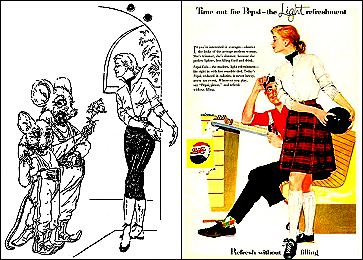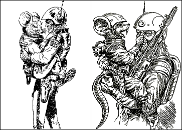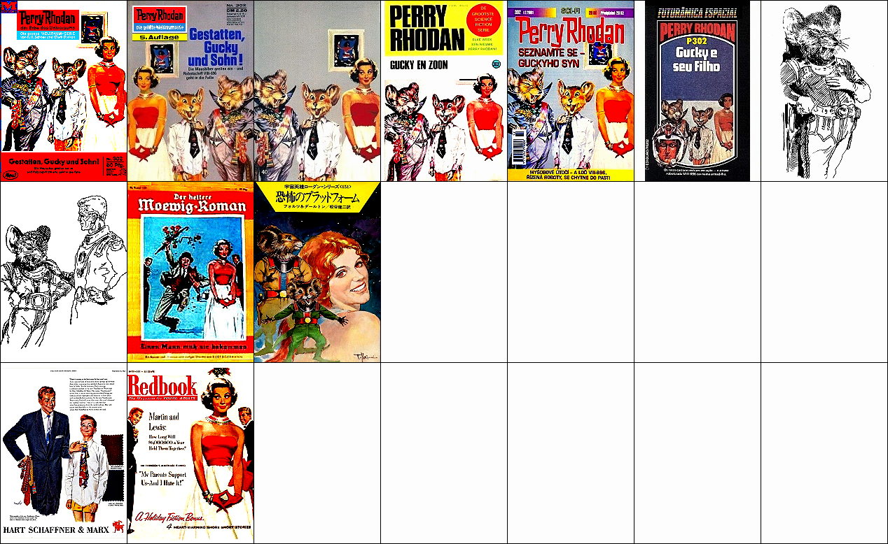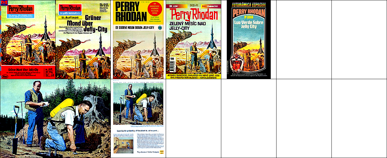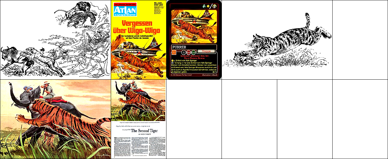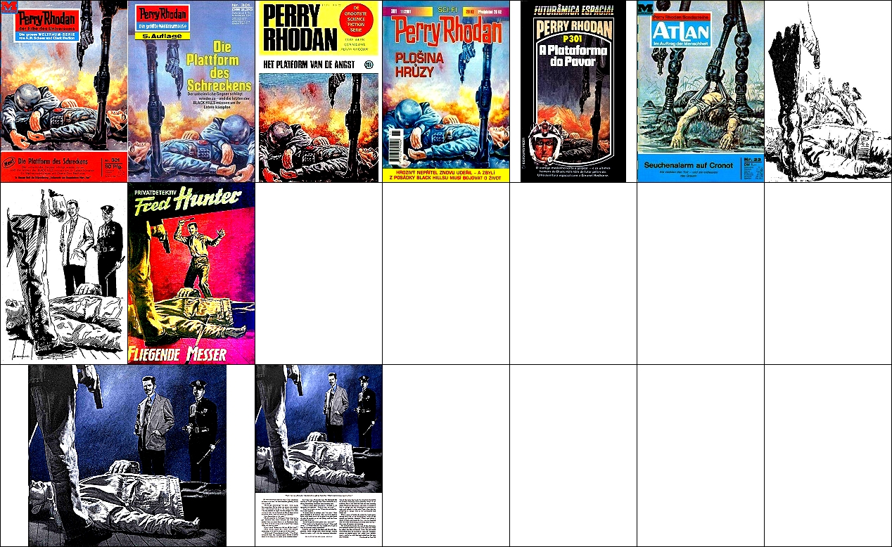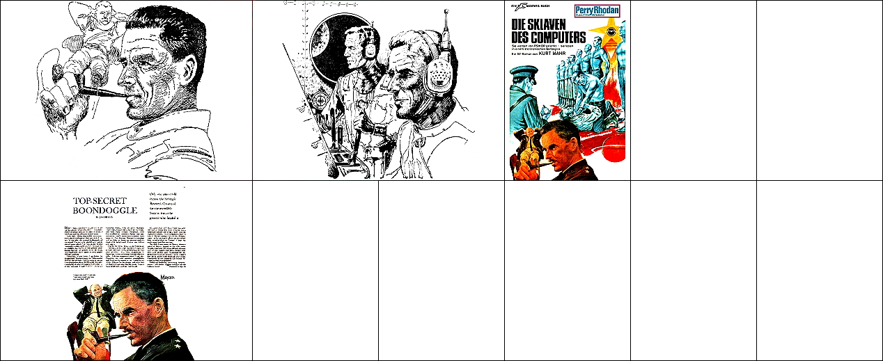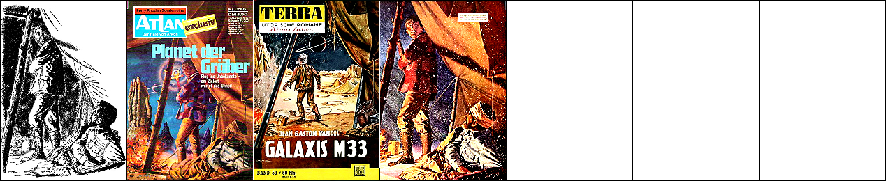 1 - 6 gleiches Bild, 6 Hände über Raumfahrer versetzt, Männer mit gleicher Körperhaltung kommen auch in 7 und 8 vor, der Gleiter ist vom Auto in 15 inspiriert, von 16 sind die Hände um 90o gedreht übernommen, die Männer sind von 17 nachgezeichnet |