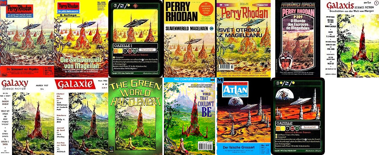 ähnliches Motiv, 1 - 6 gleiches Bild, 7 - 11 gleiches Bild, Vorbild für Landschaft von 1, 12 - 13 gleiches Bild, ähnliche Perspektive wie in 1, aber Raumschiffe durch Felsnadeln ersetzt und der Hintergrund nächtliche Szenerie auf Mond |