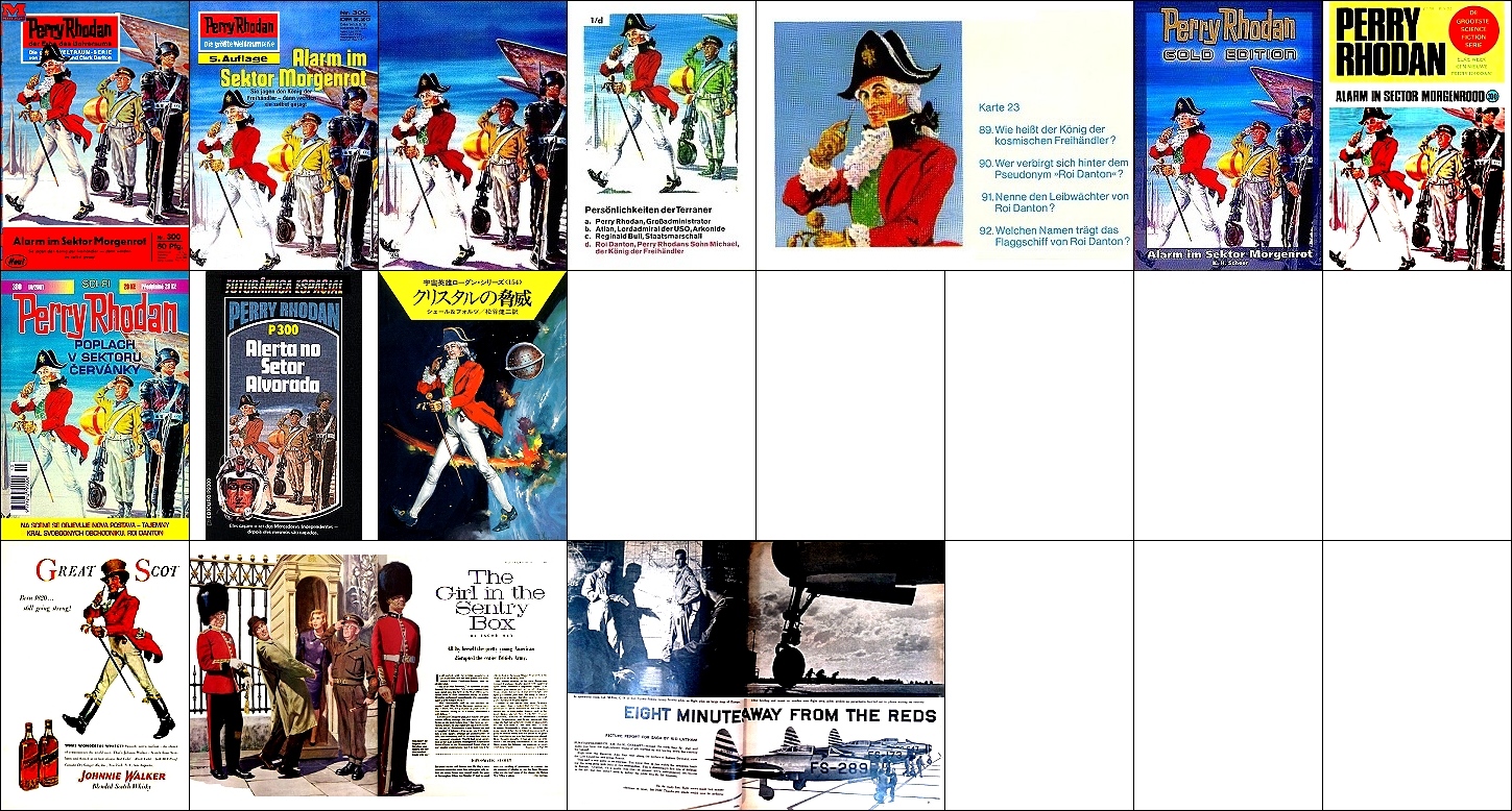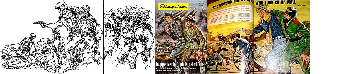 1 - 9 gleiches Bild, 5 Ausschnitt, 10 Nachzeichnung für japanische Ausgabe, 15 - 17 Vorbilder für die Figuren in 1, das Fahrgestelle des Flugzeuges hinter dem salutierenden Soldaten ist von 18 nachgezeichnet |