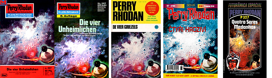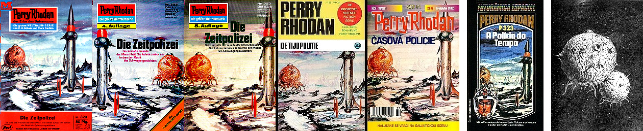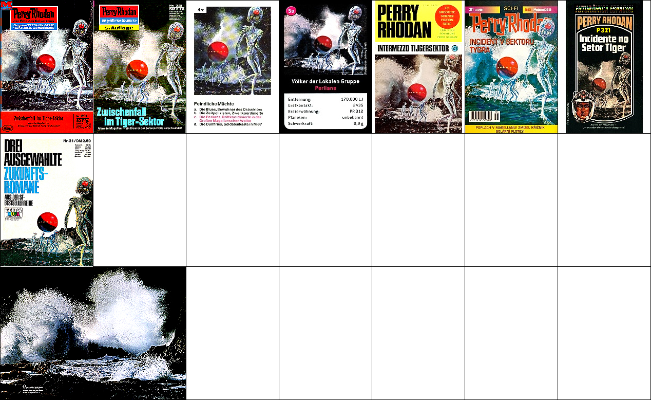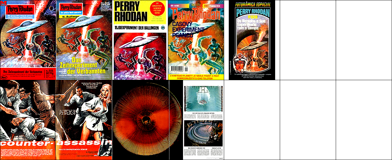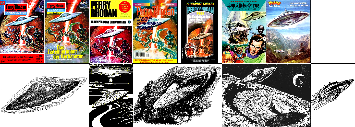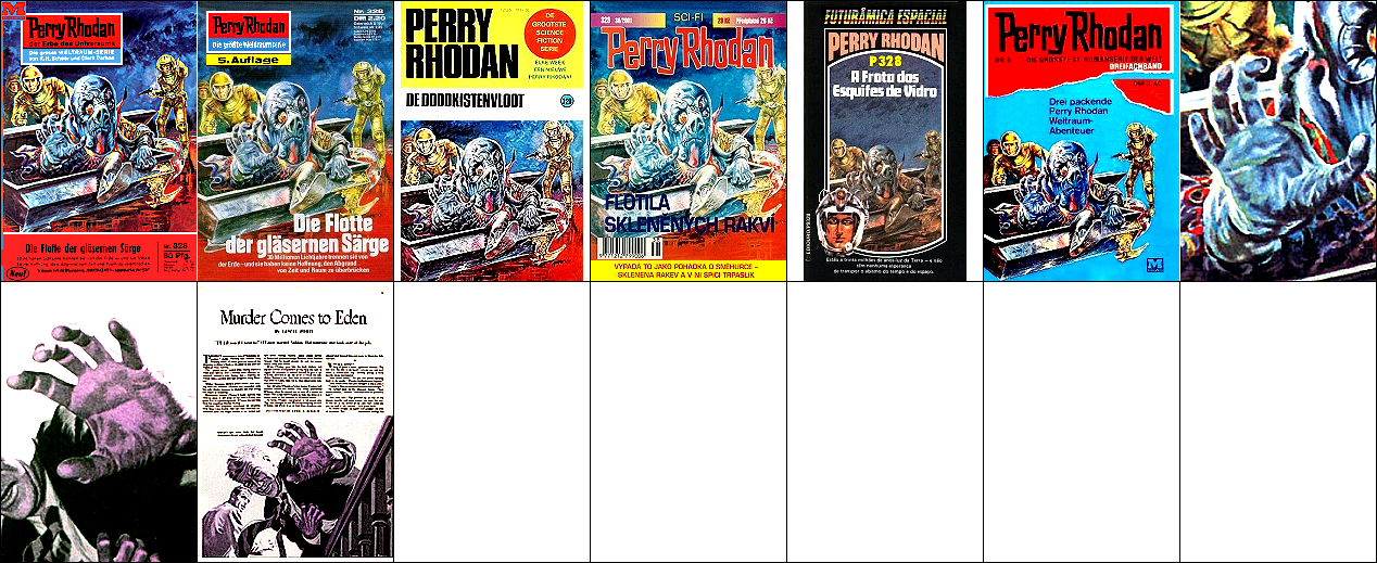 ähnliche Motive, 1 - 5 gleiches Bild, 5 mit überarbeitetem Hintergrund, 6 Motivübernahme für japanische Ausgabe, in den anderen Bildern gleiche Perspektive des Diskusbootes in Schrägfahrt, 9 Neuinterpretation von 8 für Neuauflage |