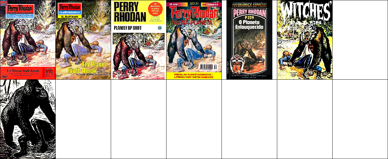 1 - 6 gleiches Bild, 6 seitenverkehrt, die Szene ist von 8 nachgezeichnet und der Affe in einen Außerirdischen verwandelt |