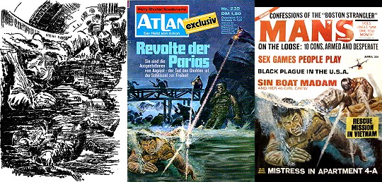 Gleiches Bild, 8 seitenverkehrt mit bearbeitetem Hintergrund, 15 Vorlage für die Körperhaltung des Mutanten, 16 für das Gerät |