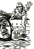 Mann versinkt im Wasser, dahinter Mann mit nach vorn gerichtetem Arm und gespreizten Fingern, der ihn retten will |