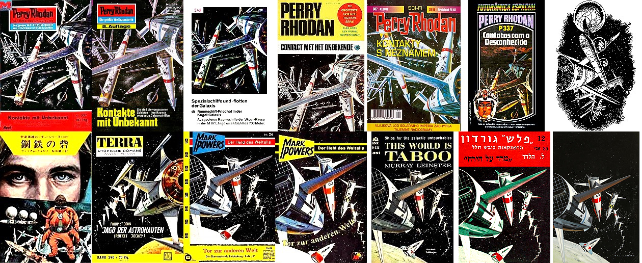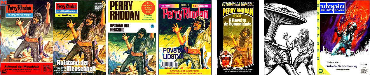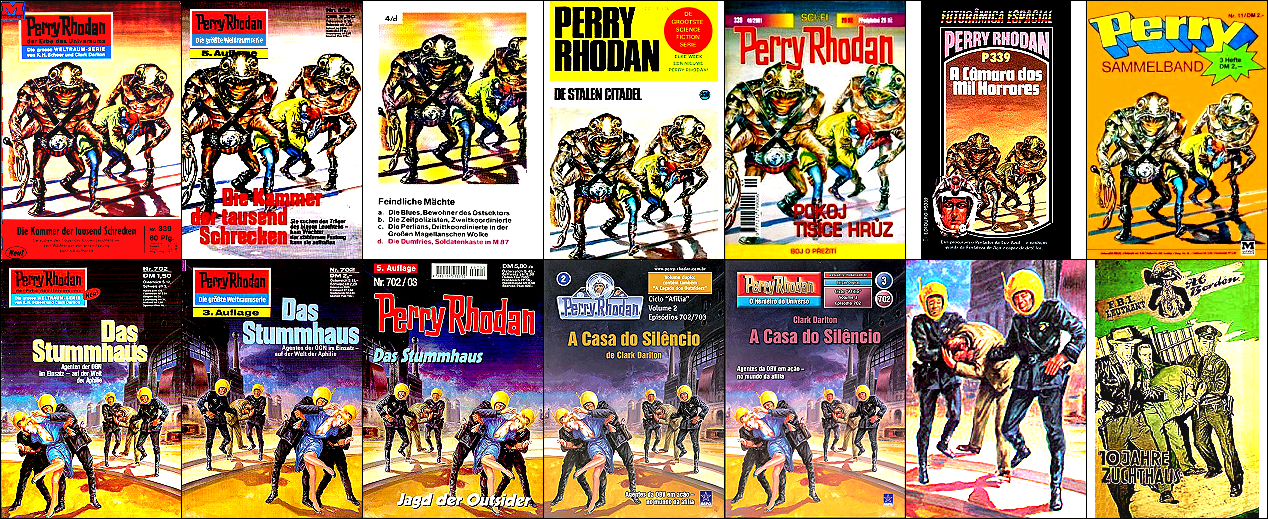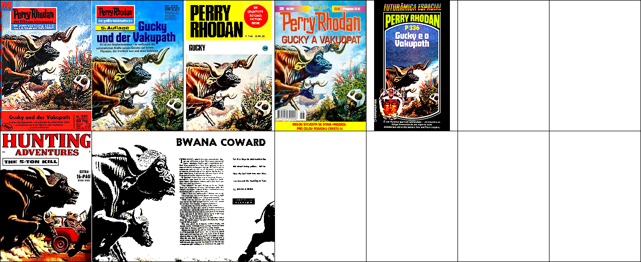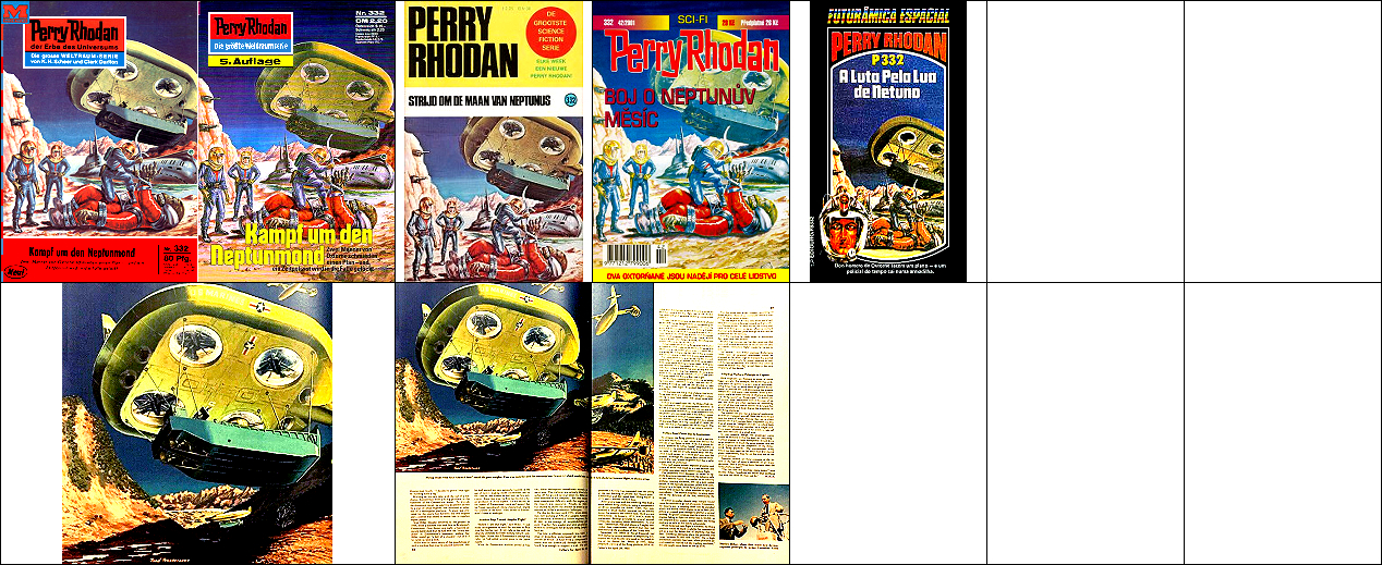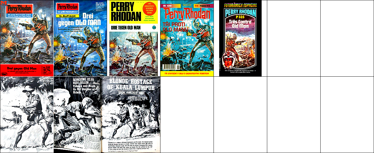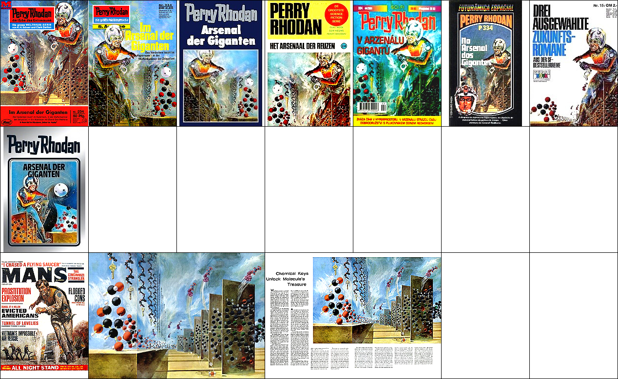 1 - 7 gleiches Bild, 2 und 3 seitenverkehrt, 7 mit überarbeitetem Hintergrund, 8 für HC-Ausgabe nachgezeichnet, 15 dürfte Vorbild für die Körperhaltung des Raumfahrers sein, der Hintergrund mit den bunten Kugeln ist von 16 übernommen |