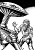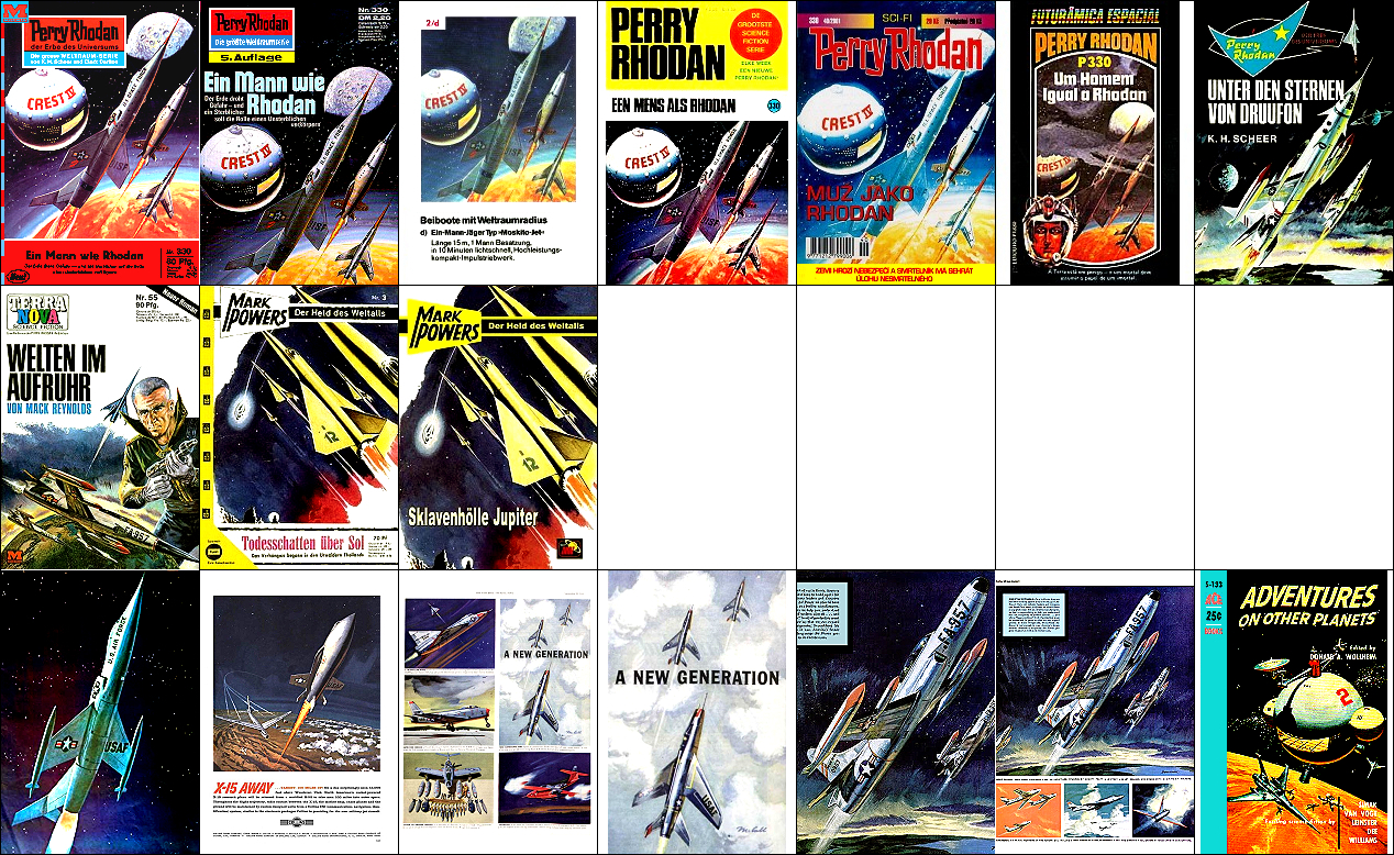 1 - 6 gleiches Bild, 6 mit leicht ergänztem Hintergrund (Wolken eingebaut), 7 und 8 ähnliche Raumjäger, 8 um 270o gedreht, 9 - 10 gleiches Bild, ähnliche Perspektive der Jäger, aus 15 ist der Raumjäger in 1 übernommen und etwas übermalt, 16 Vorbild für den mittleren Raumjägerin 1, 18 für den rechten, 19 - 20 gleiches Bild, Vorbild für 7 und 8, 21 dürfte seitenverkehrt Vorbild für das Kugelraumschiff in 1 sein, man beachte die offene Schleuse, auch die Perspektive über dem Planeten ist gleich |