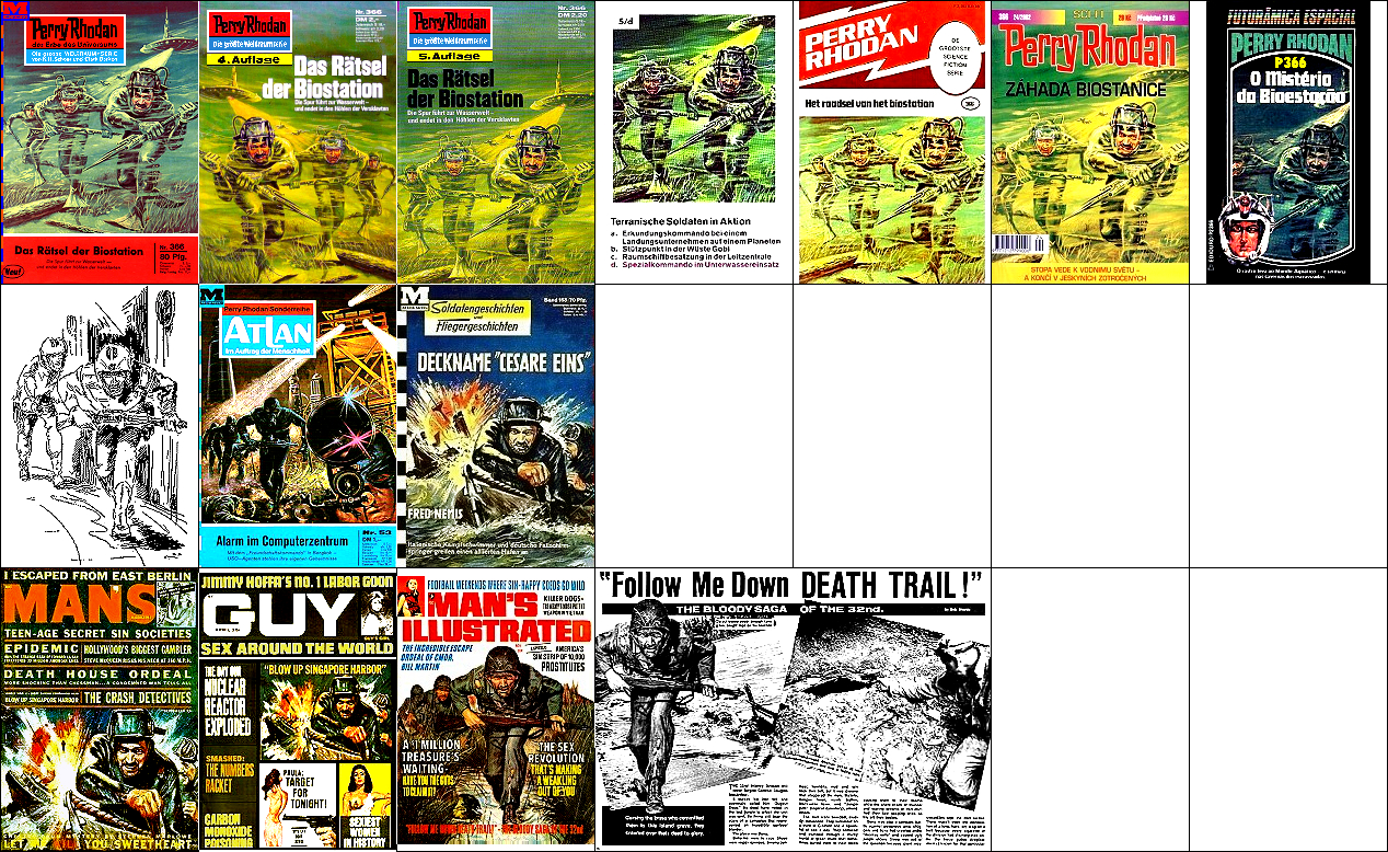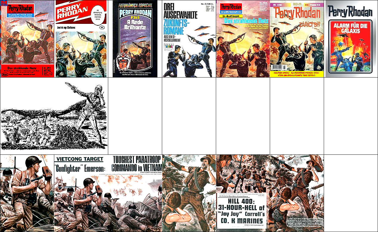 1 - 7 gleiches Bild, 2 gespiegelt, der vordere Mann erscheint auch in 10 und ist von 15 nachgezeichnet bzw. sein Gesicht in 1 ist von 15 als Collage übernommen, der mittlere Mann in 1 mit quer gehaltenem Gewehr erscheint auch in 8 und 9 und ist von 17 nachgezeichnet, 15 - 16, 17 - 18 gleiches Bild |