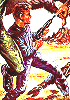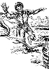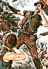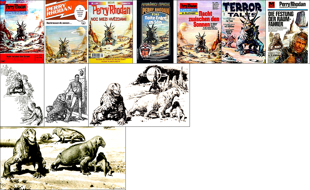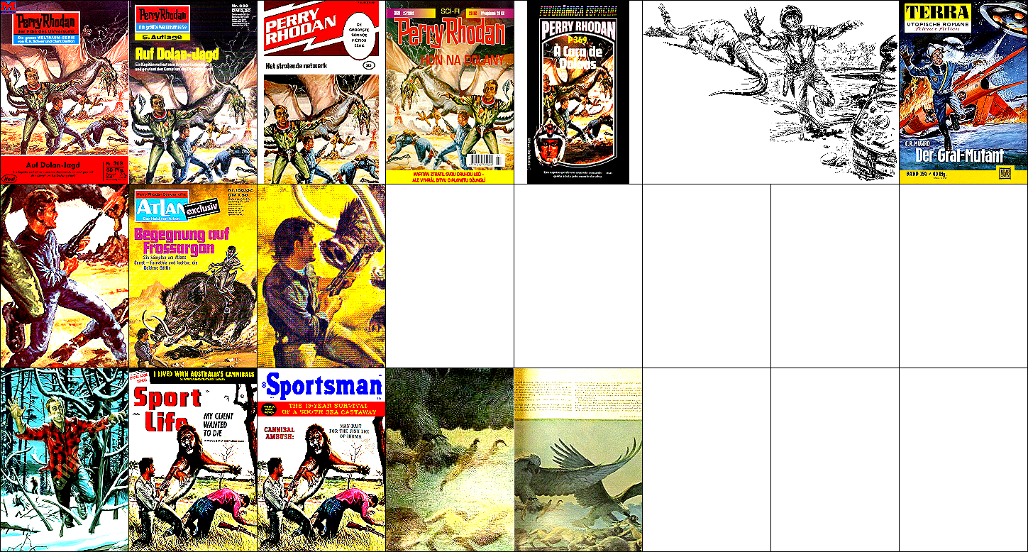 1 - 5 gleiches Bild, 4 seitenverkehrt, der flüchtende Mann kommt auch in 6 und 7 vor und ist von 15 nachgezeichnet, der schießende Mann kommt auch in 9 vor und ist zusammen mit dem fallenden Mann von 16 nachgezeichnet, 16 - 17 gleiches Bild, die Krallen des fliegenden Monsters sind vom Raubvogel in 18 nachgezeichnet |