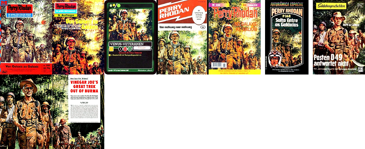 1 - 6 gleiches Bild, 4 mit überarbeitetem Hintergrund, 5 - 7 seitenverkehrt, 7 für Hardcoverausgabe seitenverkehrt nachgezeichnet, der rechte Mann kommt auch in 8 vor und ist von 16 nachgezeichnet, das auch den zielenden Soldaten in der Mitte zeigt, der Mann mit dem Funkgerät ist von 15 nachgezeichnet |