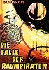 stilisierte Menschenfiguren mit Transmitterringen und Kugelraumschiff |