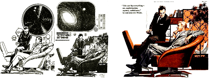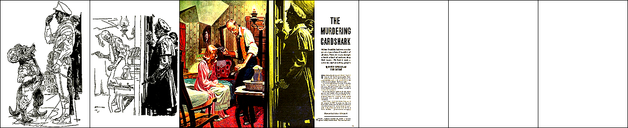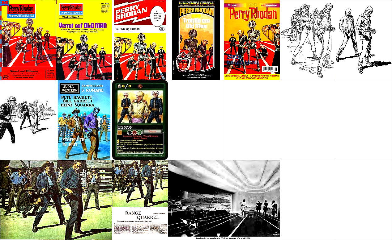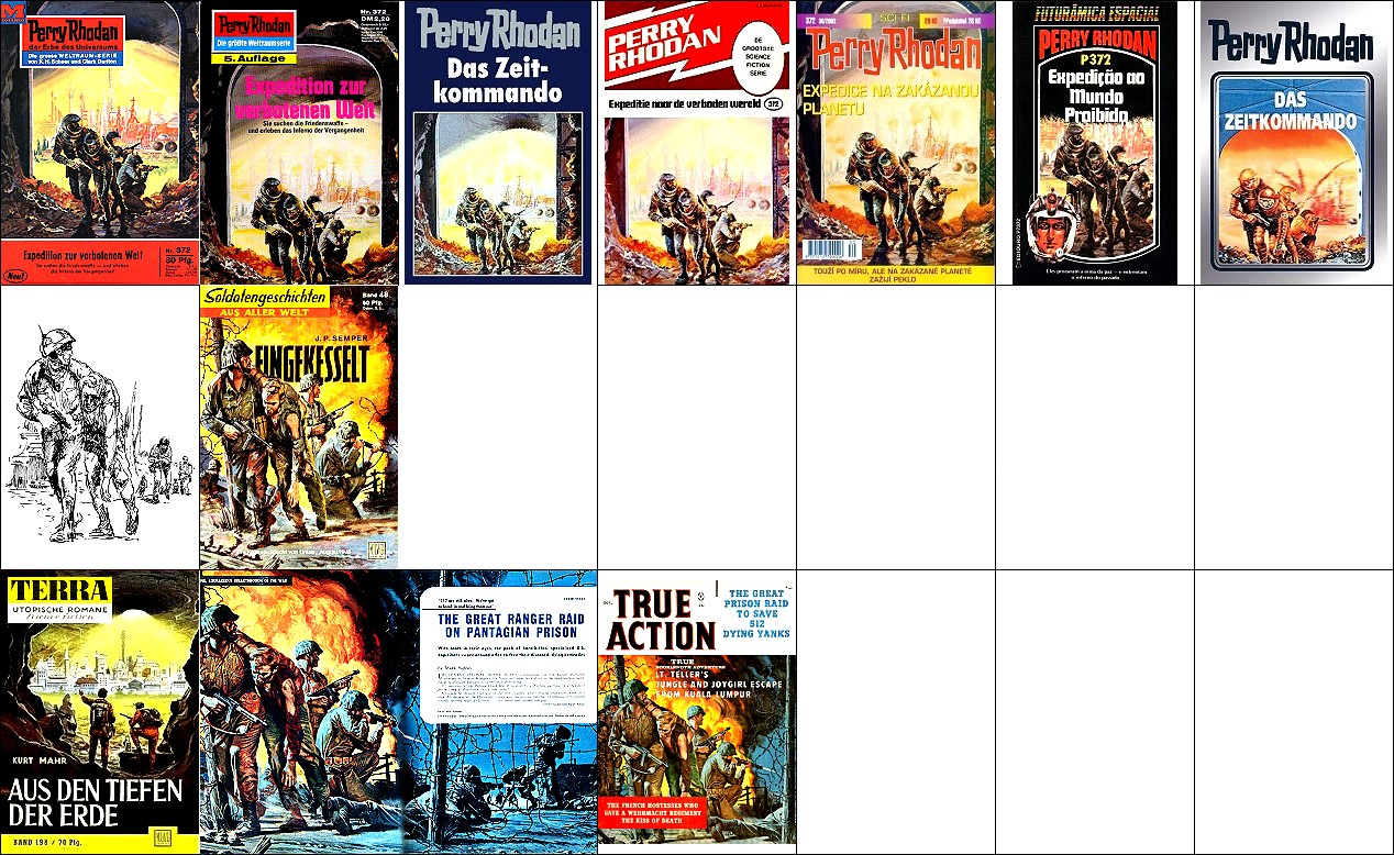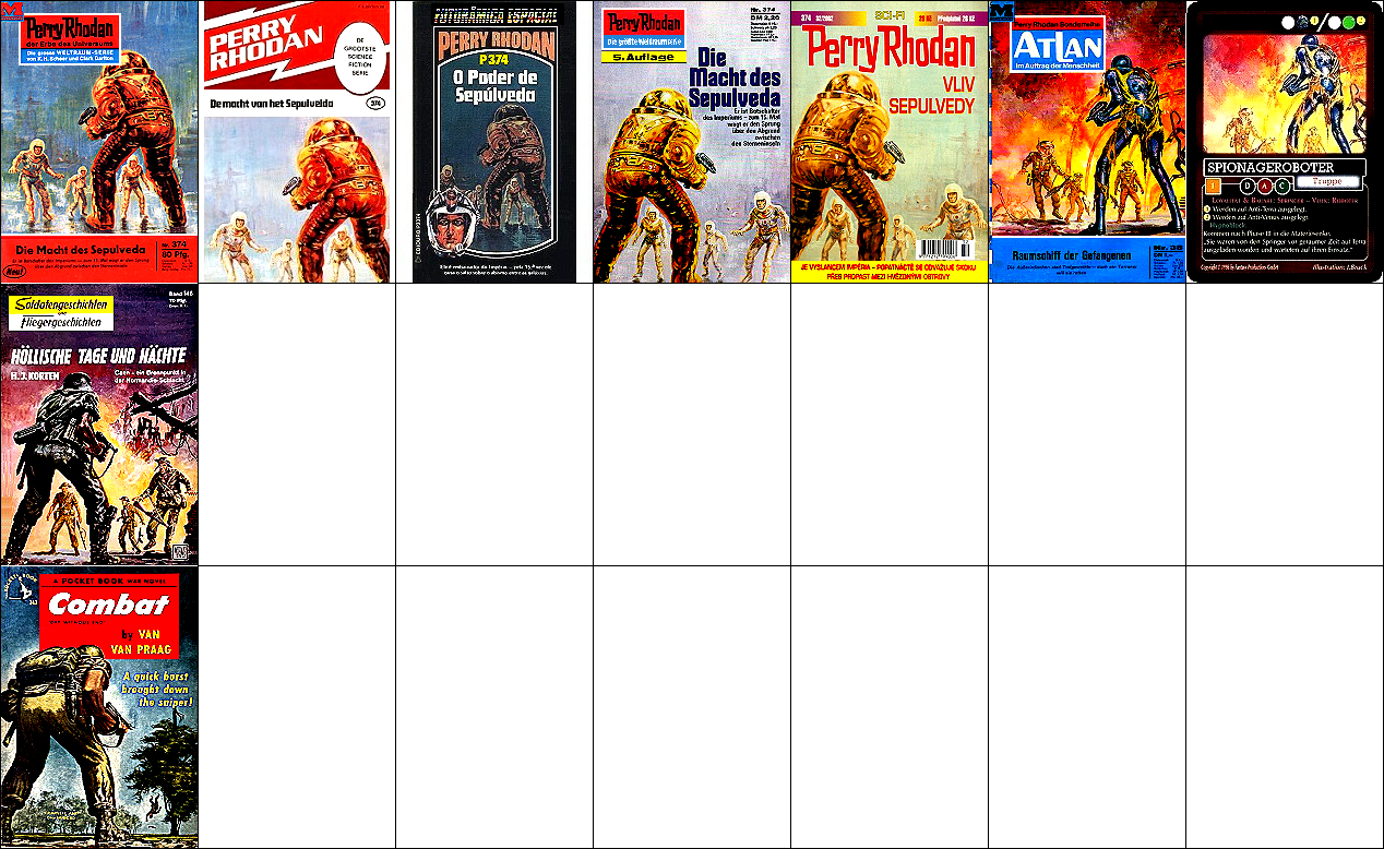 1 - 6 gleiches Bild, 6 leicht nachbearbeitet (Hintergrund oben schwarz), 7 Nachzeichnung von 1 für HC-Ausgabe, 8 und 9 Soldatengruppe sehr ähnlich, 15 Vorbild für Hintergrundszene (man beachte die Beleuchtung von oben), 16 - 17 gleiches Bild, Vorbild für die Soldatengruppe |