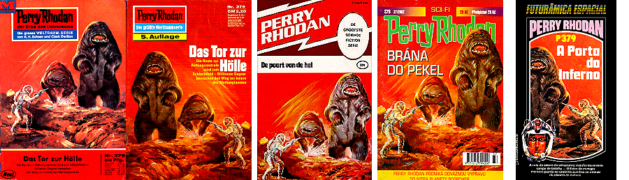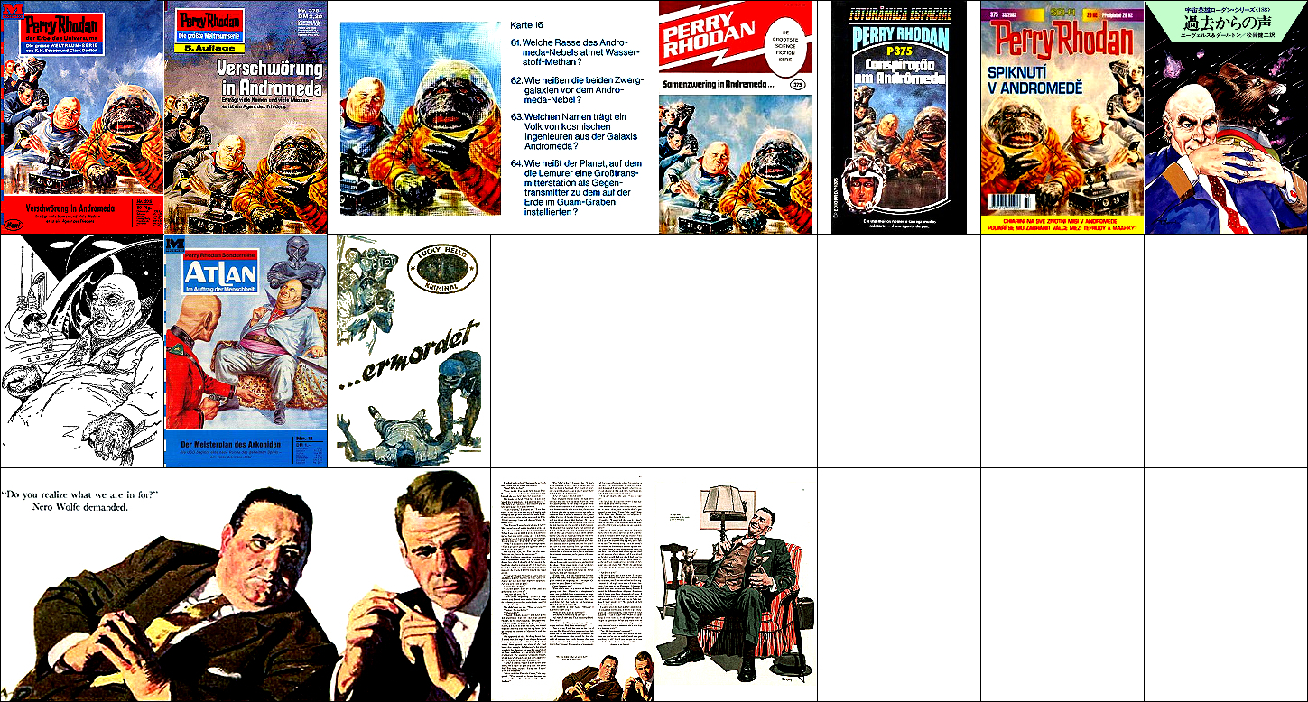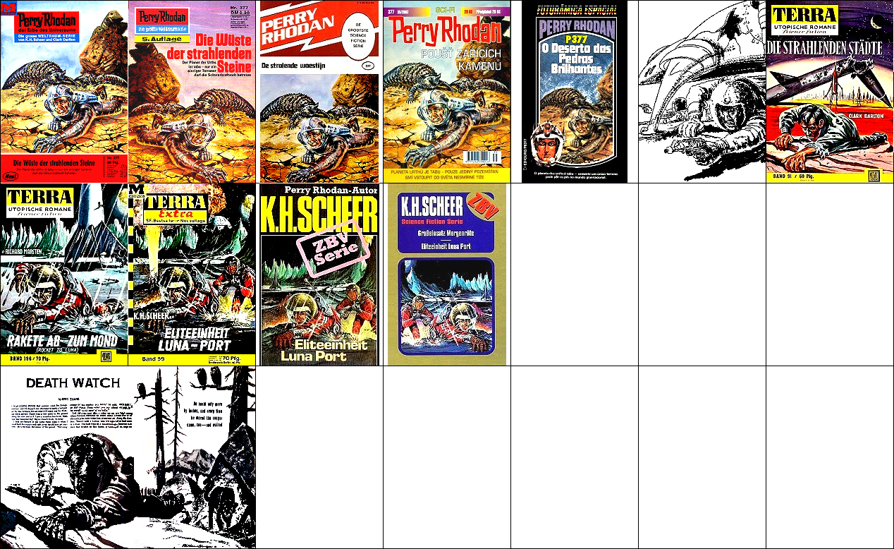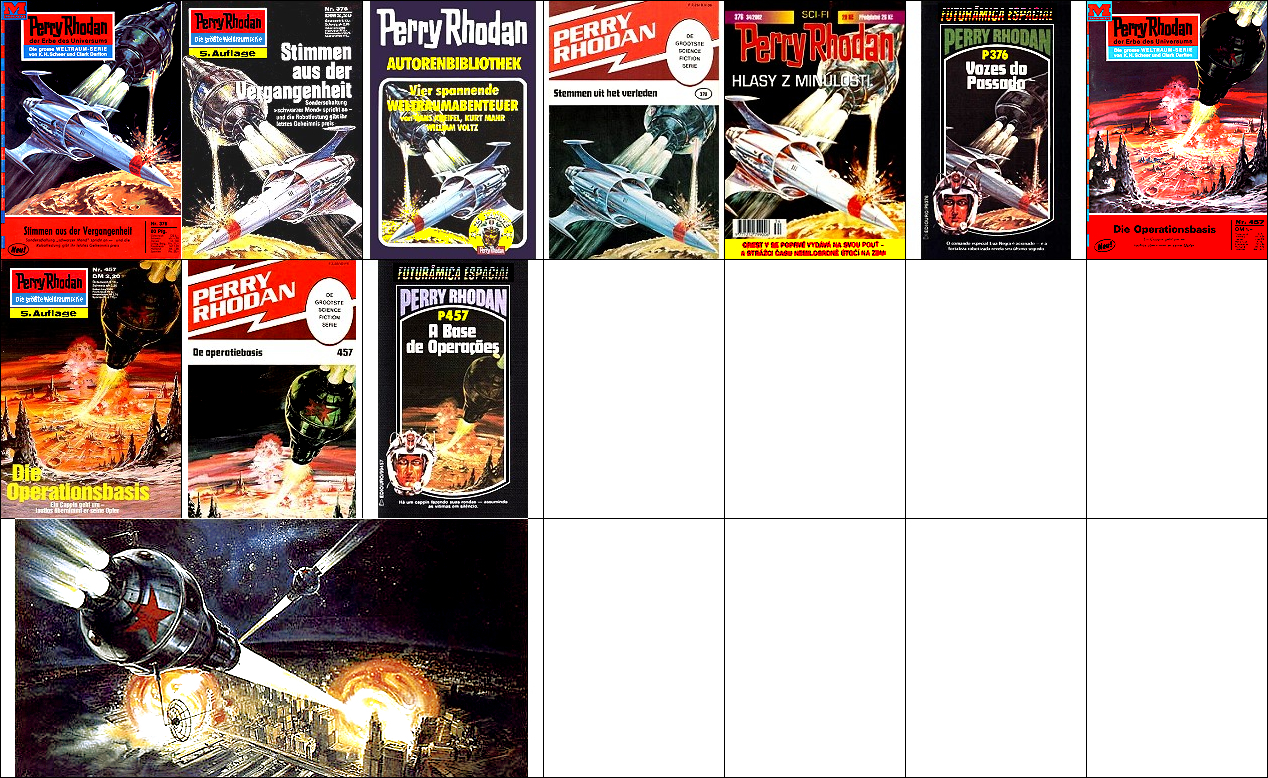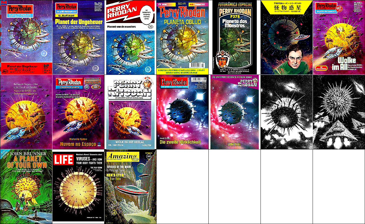 ähnliches Motiv, 1 - 5 gleiches Bild, 6 Nachzeichnung für japanische Ausgabe, 7 - 10, 11 - 12 gleiches Bild, 15 und 16 mögliche Vorbiilder für den Planeten, 17 für die Diskusraumschiffe in 1 |