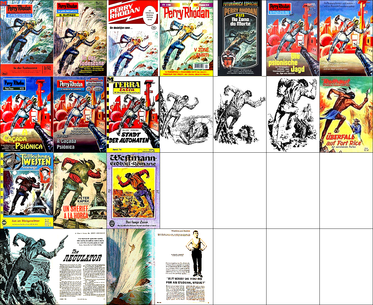 Raumschiff fast identisch, umgedreht, restliches Bild unterschiedlich. 1 - 6 gleiches Bild, 2 - 3 seitenverkehrt, 7 - 10 gleiches Bild, das Raumschiff dürfte aus 15 nachgezeichnet bzw. entnommen worden sein |