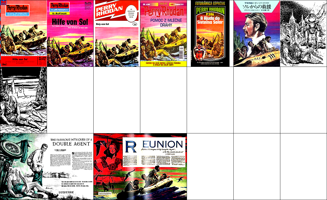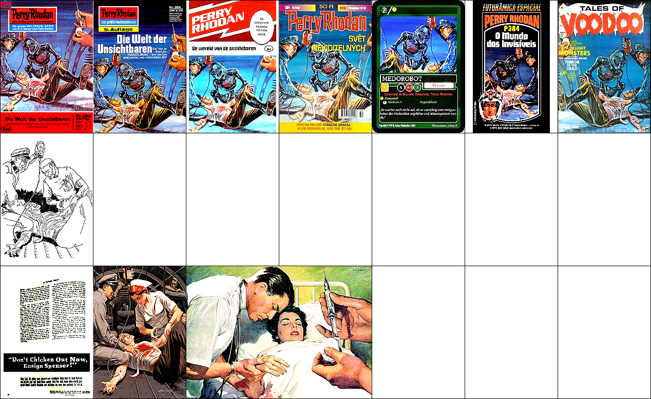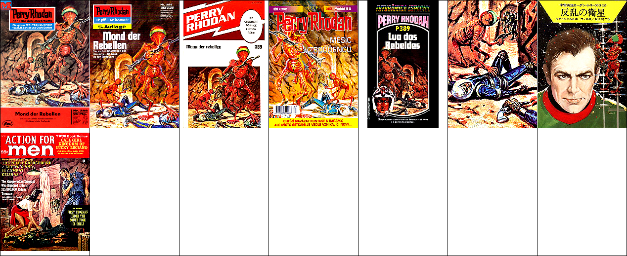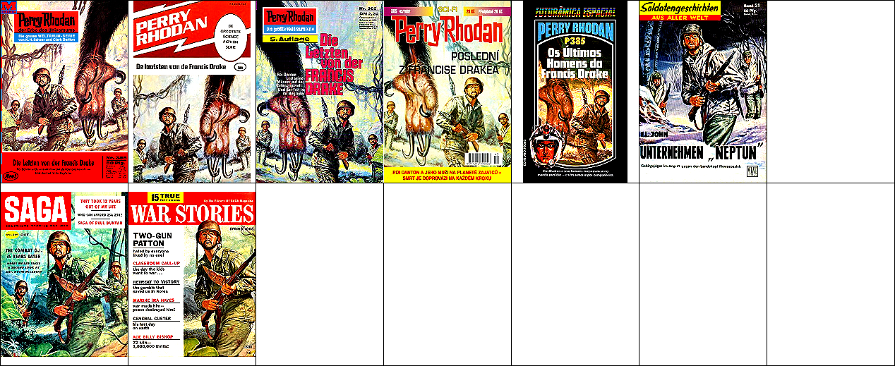1 - 5 gleiches Bild, 4 und 5 seitenverkehrt, 7 Neuinterpretation eines der Außerirdischen für japanische Ausgabe, die Körperhaltung des hinteren liegenden Mannes und des sich darüberbeugenden Außerirdischen sind von 8 nachgezeichnet |