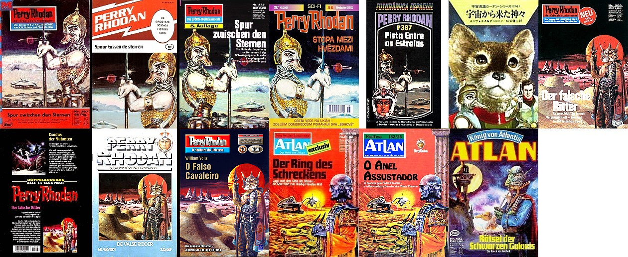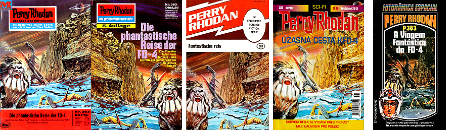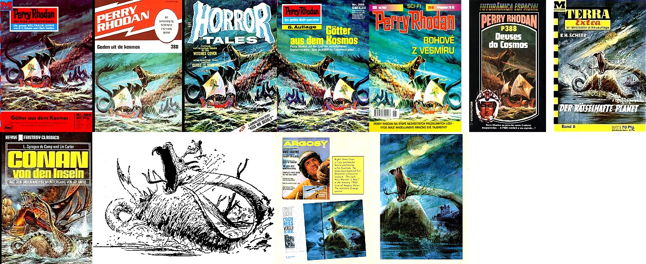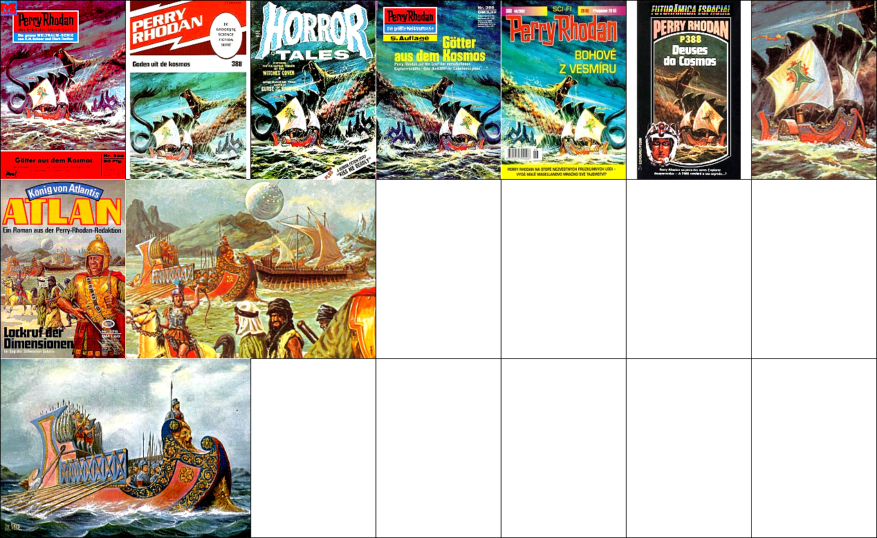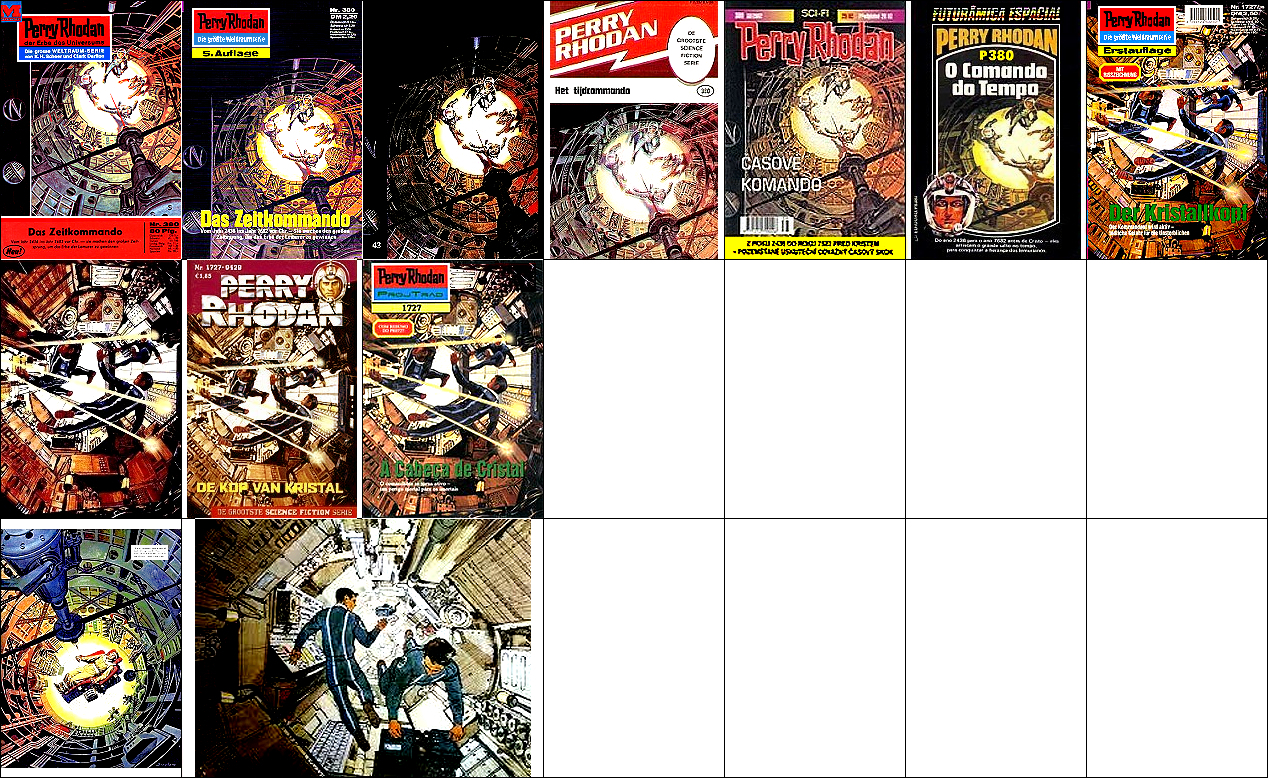 1 - 5 gleiches Bild, 4 und 5 seitenverkehrt, 7 Neuinterpretation eines der Außerirdischen für japanische Ausgabe, die Körperhaltung des hinteren liegenden Mannes und des sich darüberbeugenden Außerirdischen sind von 8 nachgezeichnet |