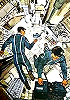 Blick von oben auf stehende bzw. schwerelos herumfliegende Raumfahrer im Innern einer Raumstation, siehe auch