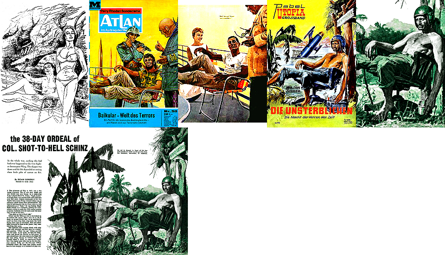 1 - 5 gleiches Bild, 5 seitenverkehrt, 6 Nachzeichnung für japanische Ausgabe, der liegende Mann links kommt auch in 7 und 8 vor und ist von 15 nachgezeichnet, die Männer auf dem Schlauchboot in 1 sind von 16 nachgezeichnet |