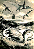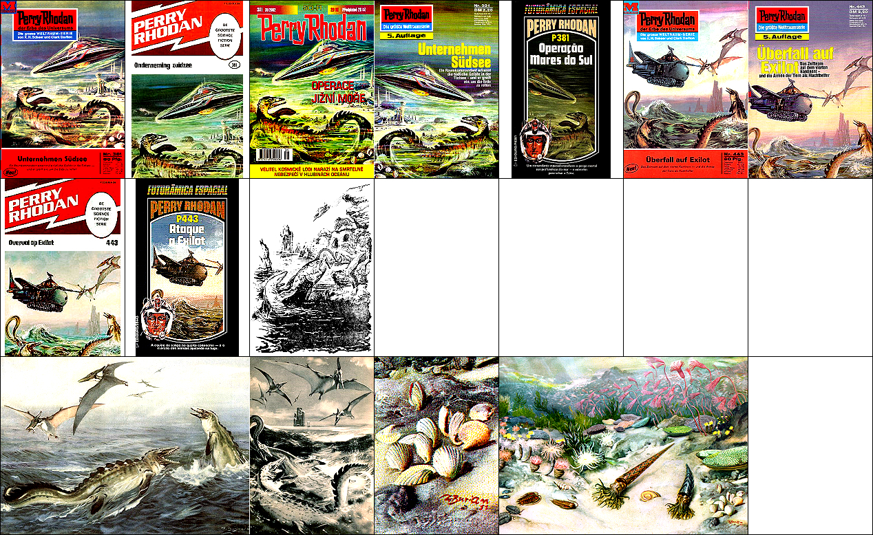 Ähnliches Motiv, 1 - 5 gleiches Bild, 4 - 5 seitenverkehrt, 6 - 9 gleiches Bild, 15 dürfte Inspirationsquelle für die Meeressaurier gewesen sein, auf jeden Fall für 6 (man beachte den zweiten Saurier mit Schlangenhals), 16 ist das Vorbild für die Pterandonten und den aus dem Wasser springenden Saurier rechts in 6, in 17 findet sich das Vorbild für die Muscheln in 1 am Meeresgrund |