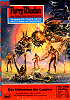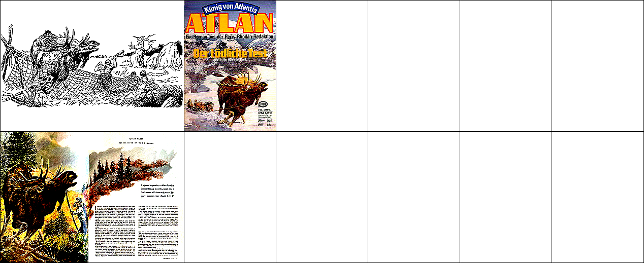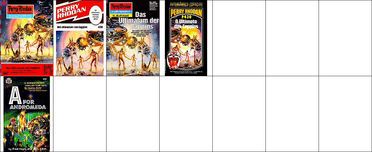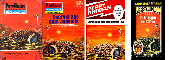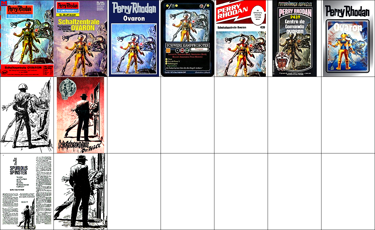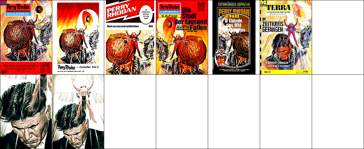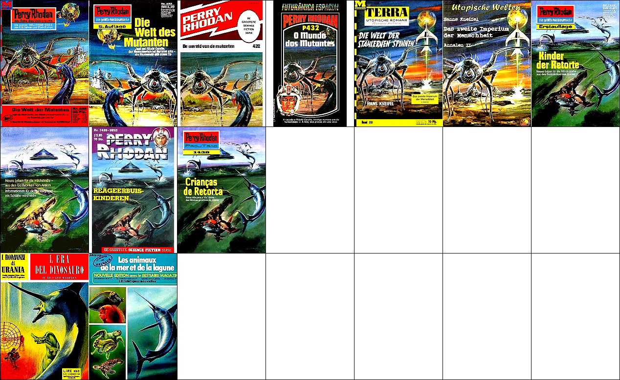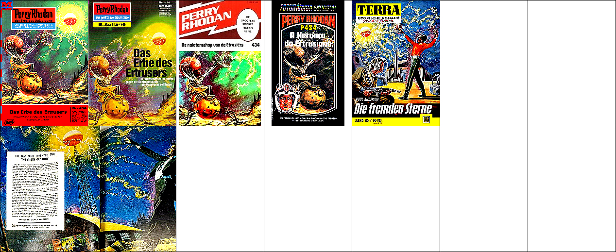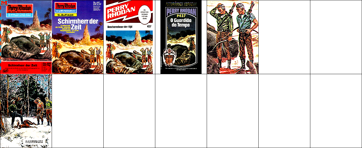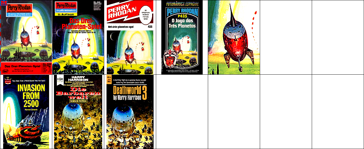 1 - 4 gleiches Bild, 4 mit leicht überarbeitetem Hintergrund, der Bildhintergrund mit den Felsen und dem leuchtenden grünen Bogen am Horizont ist von 8 nachgezeichnet, das Raumschiff dürfte von 9 bzw. 10 inspiriert sein (man beachte das Oberteil und die Kugeln an den Landefinnen), 9 - 10 gleiches Bild |