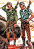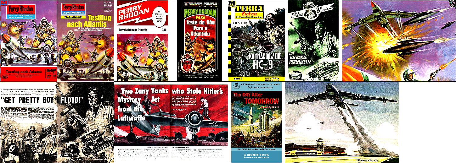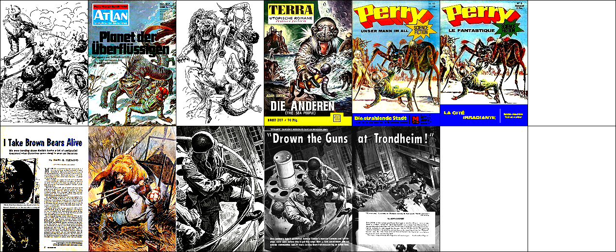 1 - 4 gleiches Bild, 2 und 4 seitenverkehrt, der Zentaur mit der Maschinenpistole hat die gleiche Körperhaltung wie der Mann in 5 bzw. 6, welche von 8 nachgezeichnet sind, das Flugzeug ist von 9 nachgezeichnet,die pfeilförmigen Jagdflugzeuge von 10 und das Flugzeug darüber von 11 |