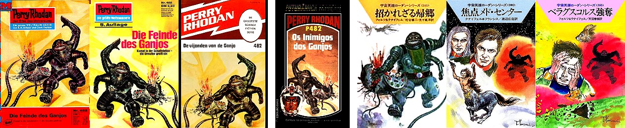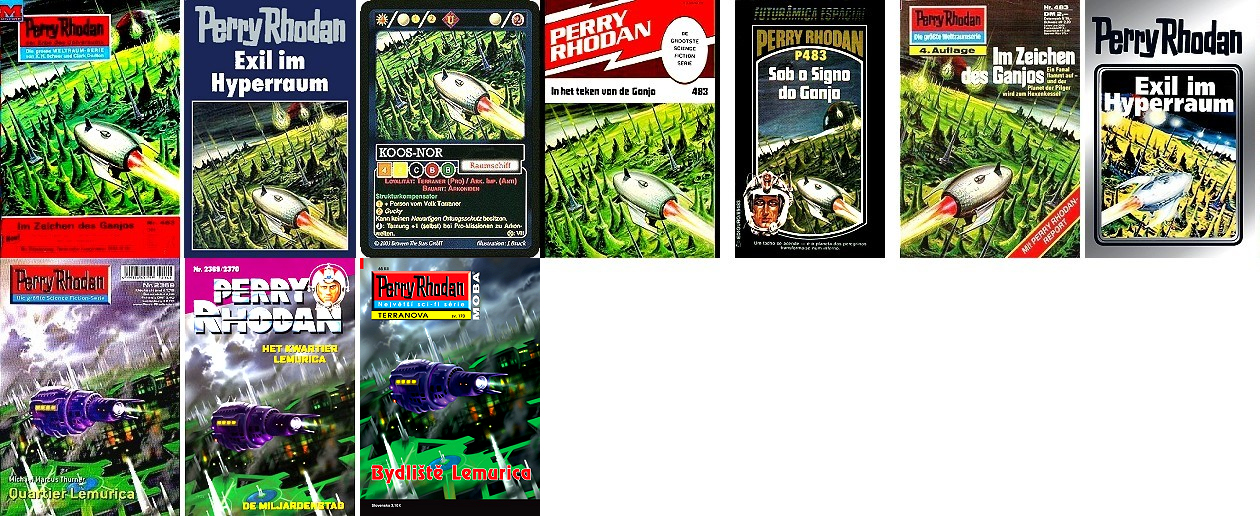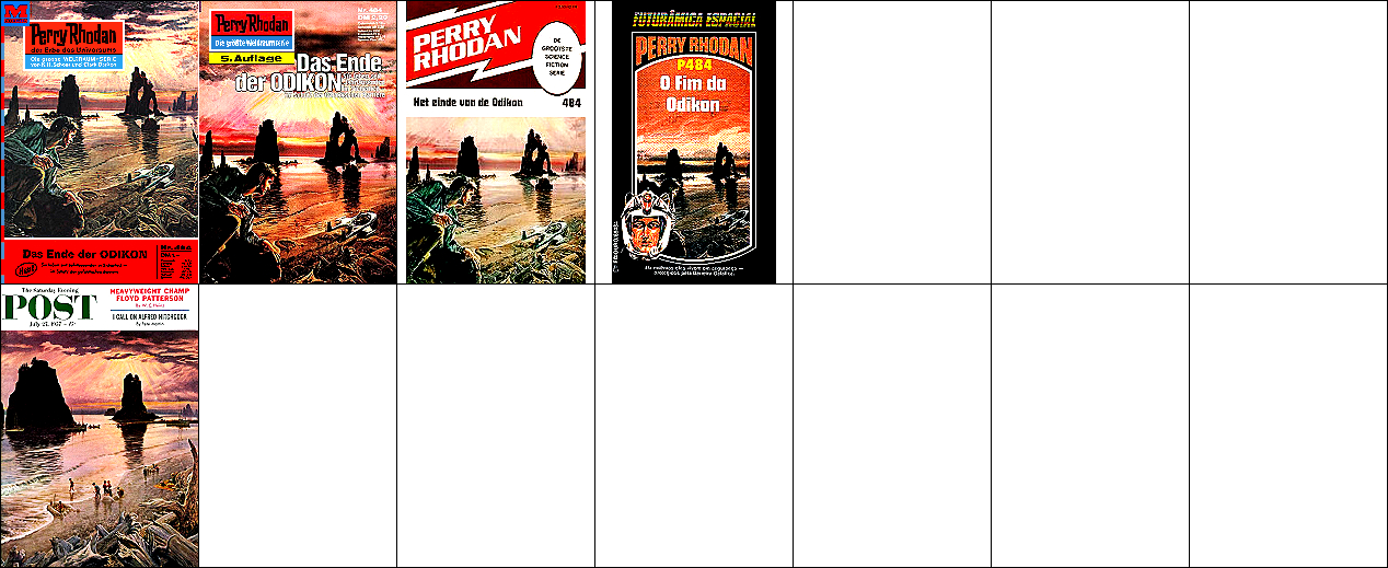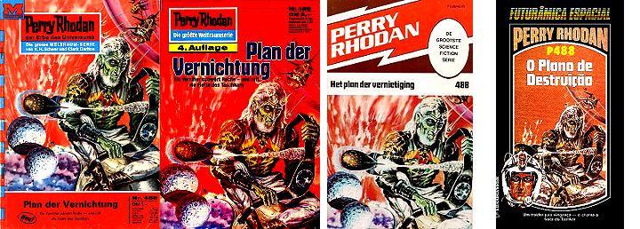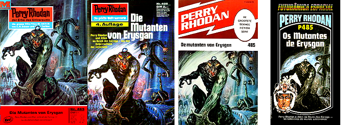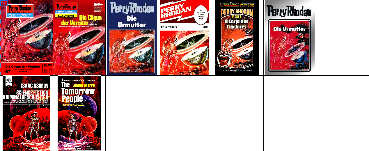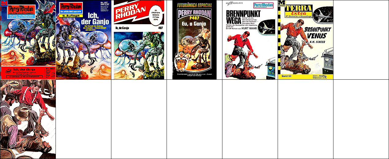 1 bis 7 gleiches Bild, 6 und 7 seitenverkehrt, 7 für Hardcoverausgabe nachbearbeitet (anderes Raumschiff, aber Hintergrund gleich), 8 - 10 gleiches Bild, ähnliches Motiv wie 1 |