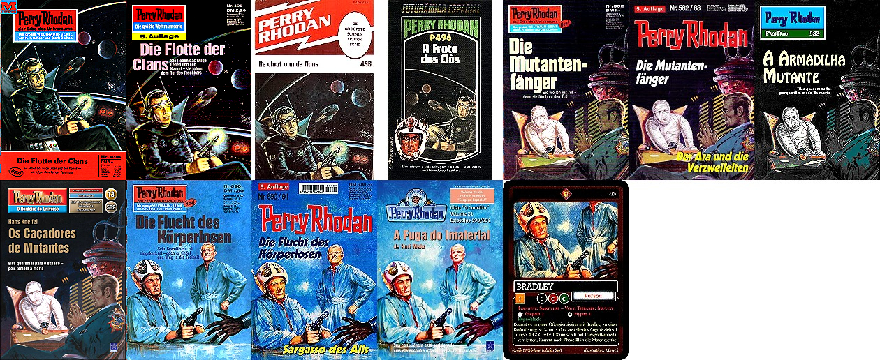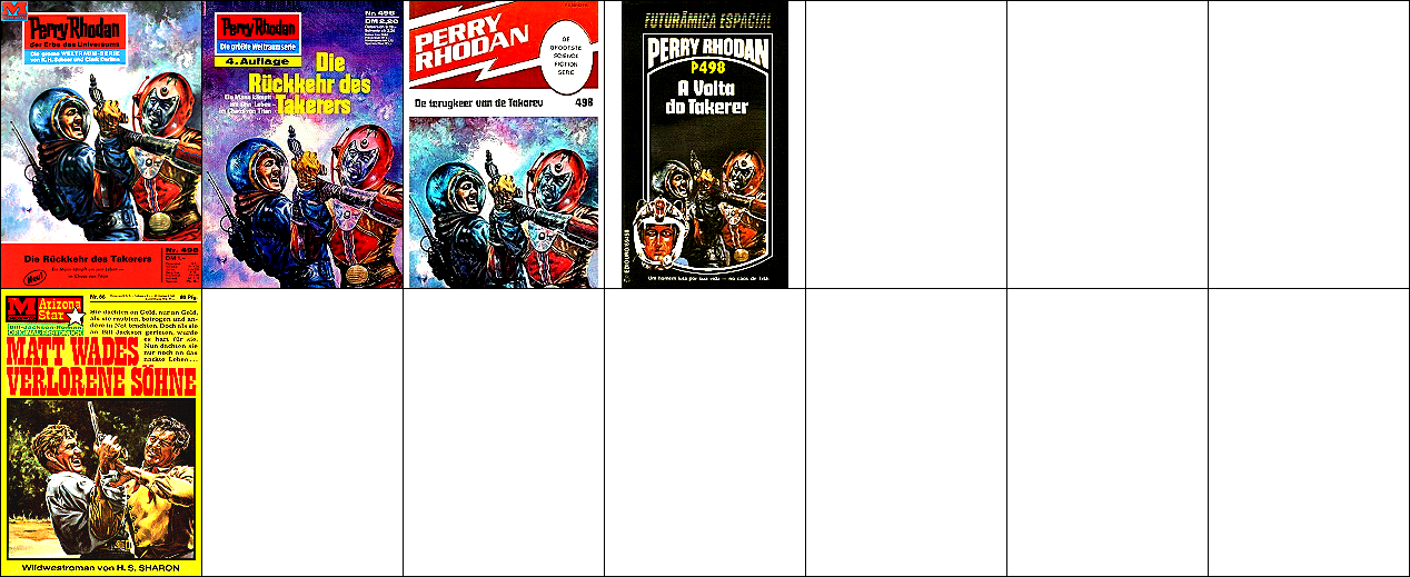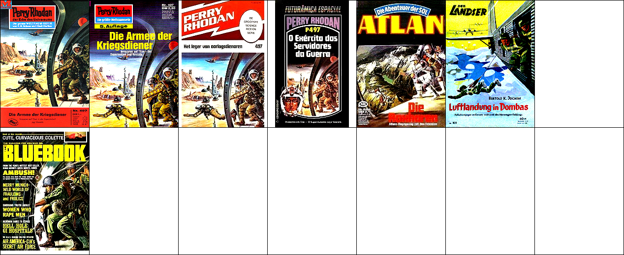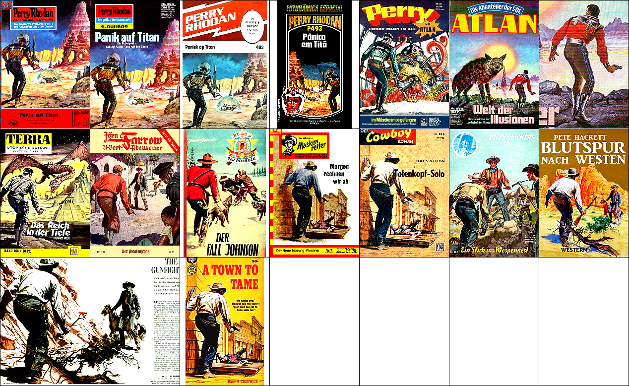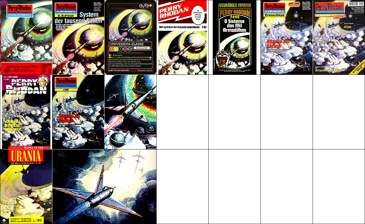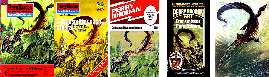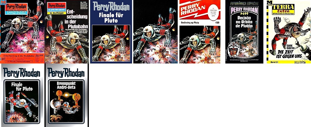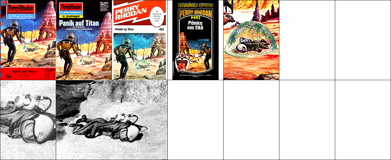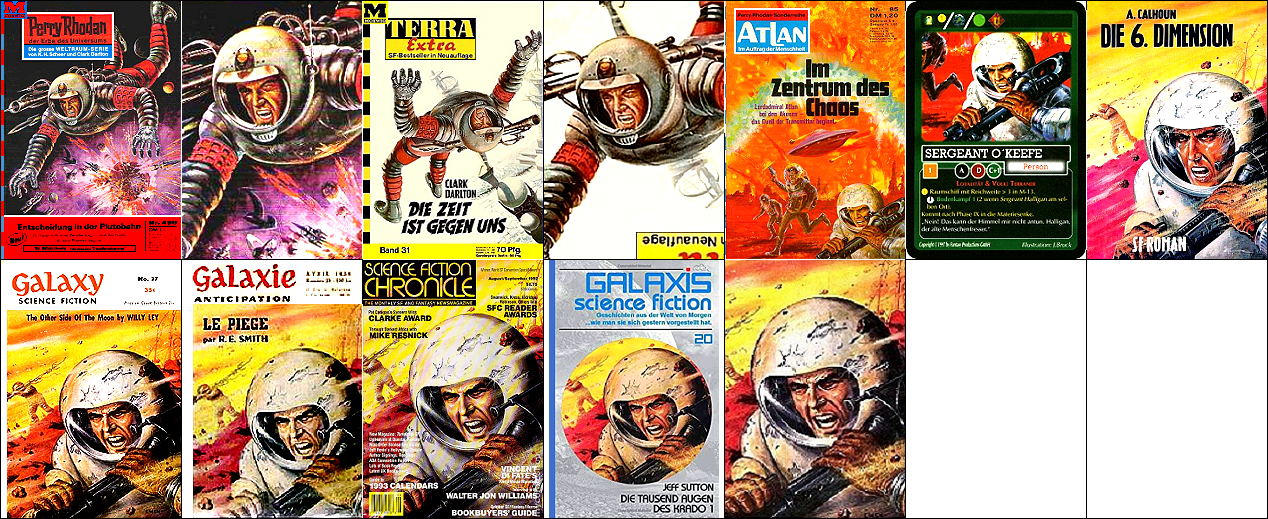 1 - 6 gleiches Bild, 6 seitenverkehrt, 7 umgedreht mit anderem Hintergrund, Raumfahrer aus diesem Bild in 1 eingebaut, 8 Nachzeichnung für HC-Ausgabe, seitenverkehrt zu 1, 9 ähnliches Motiv |