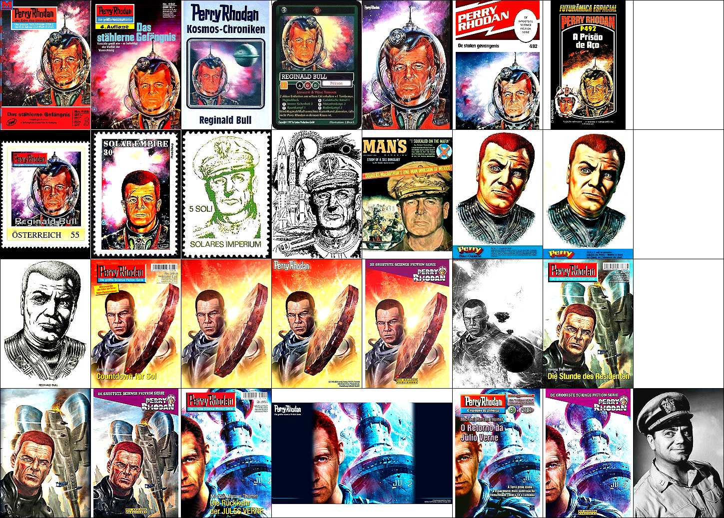 Raumfahrer in 1 von 3 umgedreht übernommen und mit anderem Hintergrund ergänzt; Gesicht in 1, 3 und in 5 von 8 nachgezeichnet, restliches Bild unterschiedlich. 1 - 2, 3 - 4, 5 - 6, 8 - 12 gleiches Bild, 2, 4 und 6 Ausschnitte |