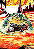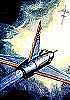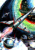 Ring aus Eisbrocken, darin Rakete vor Kugelraumer im Schutzschirm |