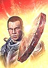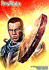 Raumfahrer zielt auf in Schutzschirm gehüllten liegenden Mann |