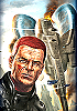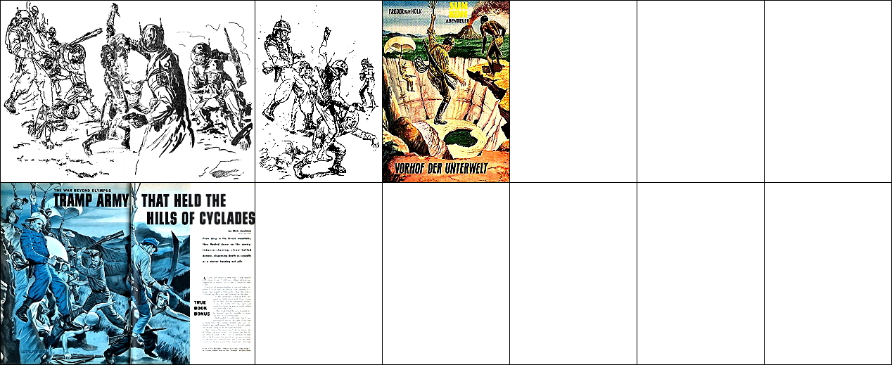 1 - 4 gleiches Bild, 4 seitenverkehrt, der liegende Mann im Schutzschirm ist gespiegelt von 8 nachgezeichnet (man beachte die Sauerstoffflaschen am Rücken mit dem emporstehenden Schlauch) |