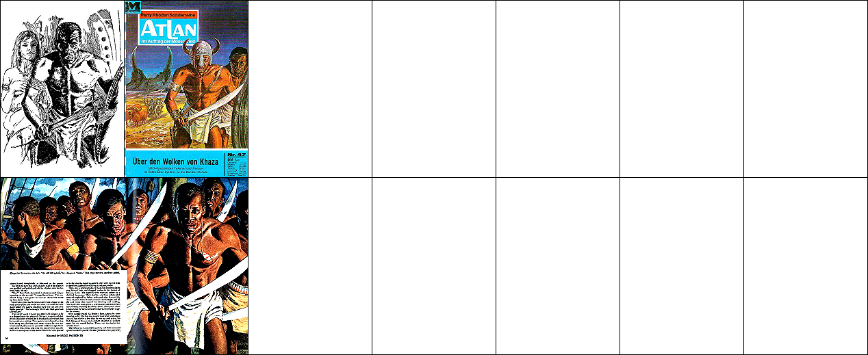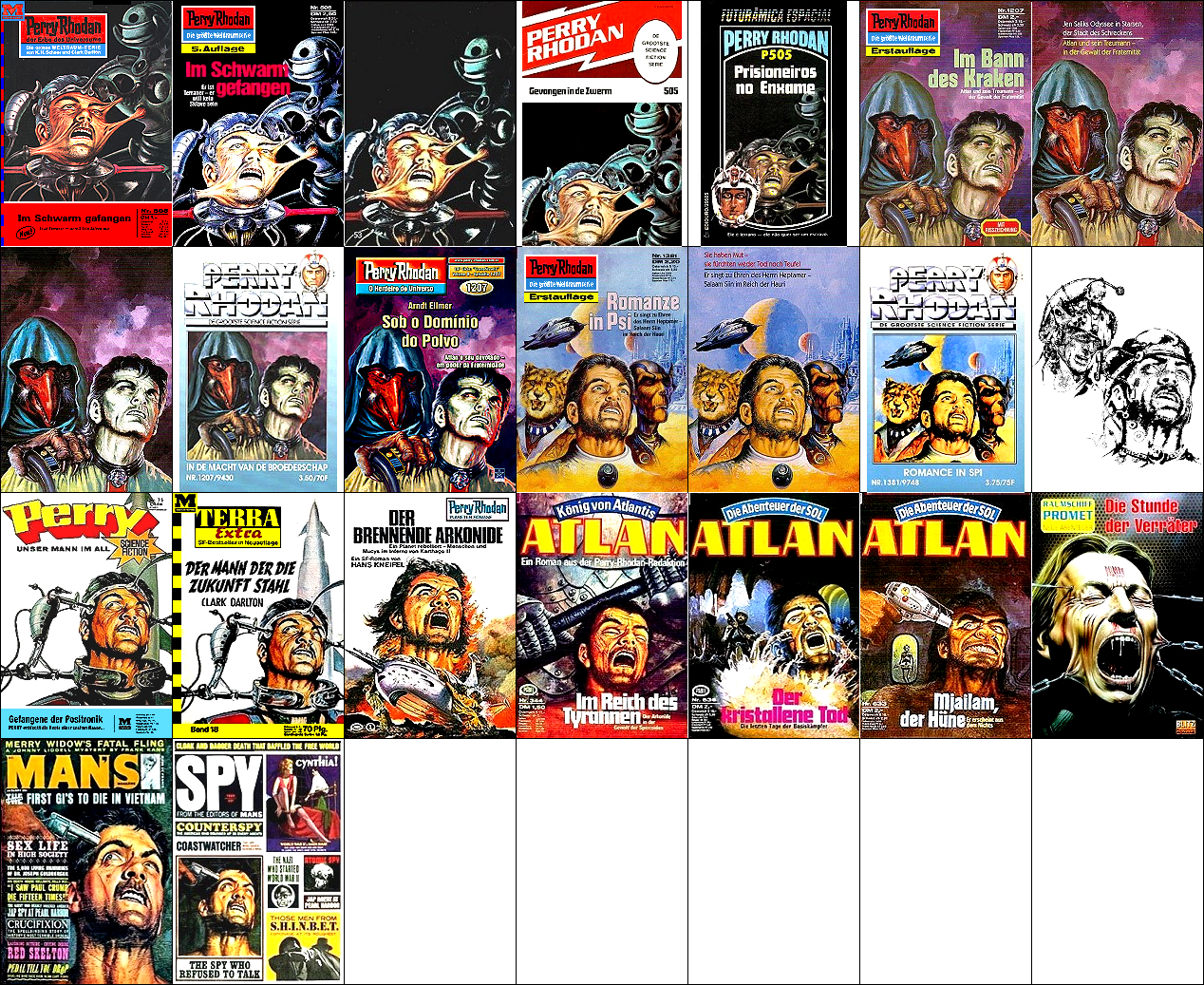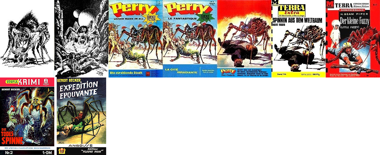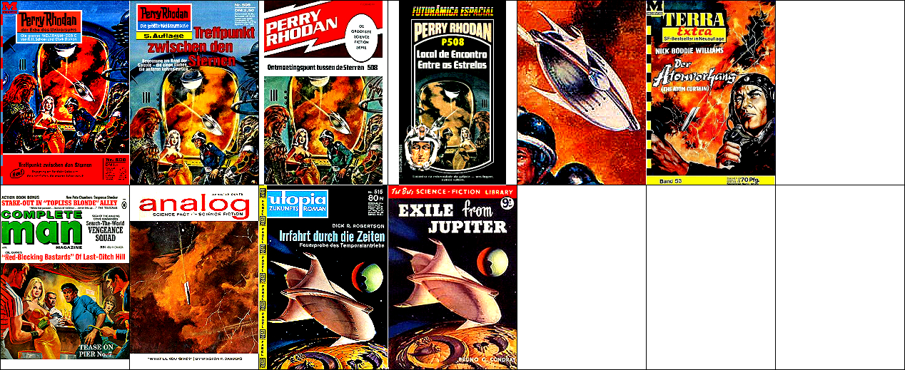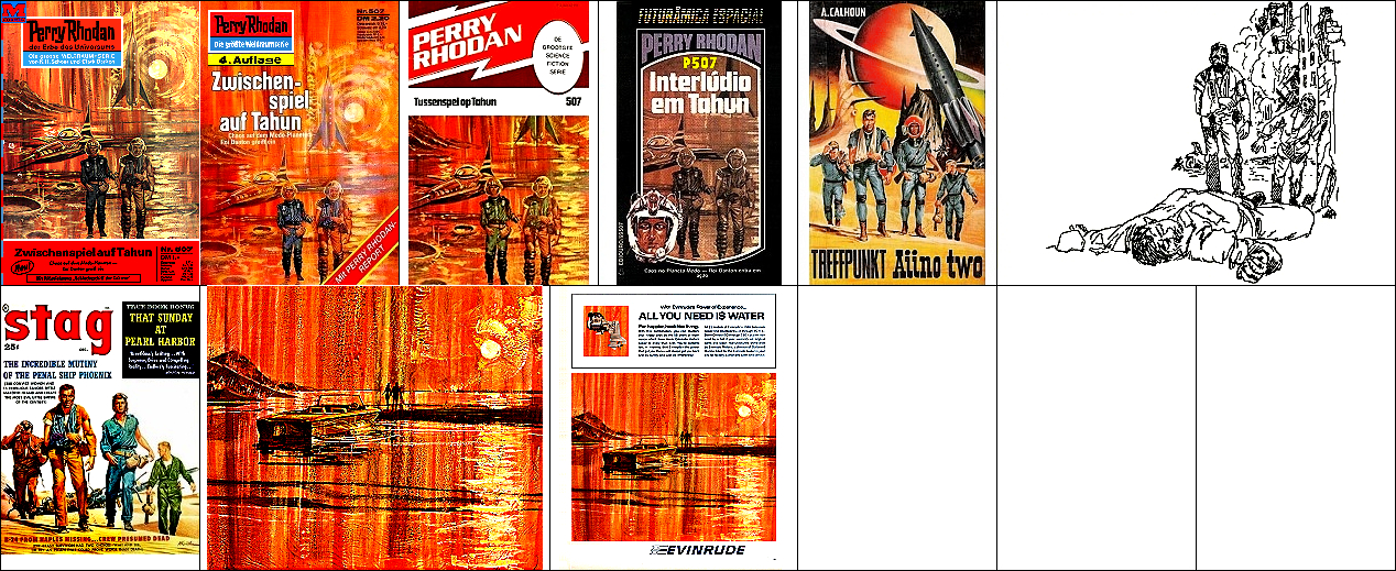 1 - 3 gleiches Bild, 4 leicht farbveränder und seitenverkehrter Ausschnitt, eine ähnliche Hintergrundszene mit dem kosmischen Nebel kommt auch in 6 vor und dürfte von 9 inspiriert sein, die Szene im Vordergrund ist von 8 nachgezeichnet, 10 - 11 gleiches Bild, mögliches Vorbild für das Diskusraumboot |