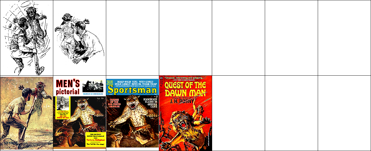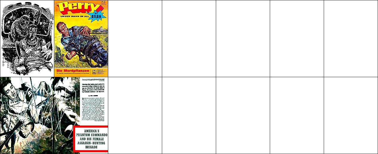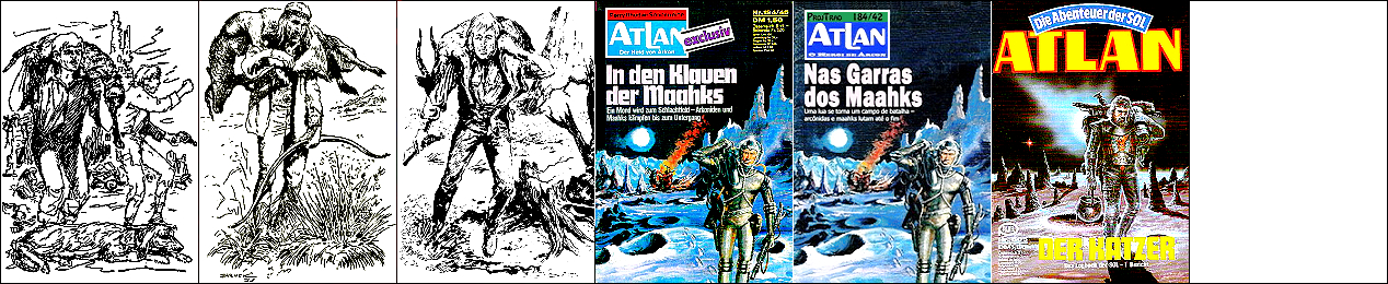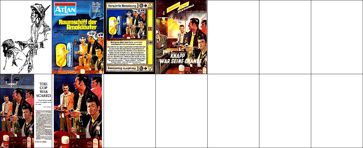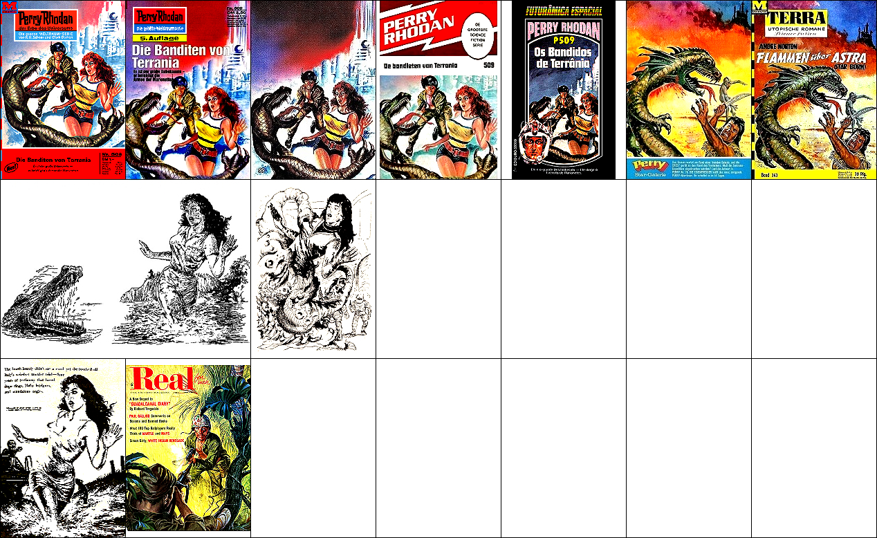 1 - 5 gleiches Bild, 6 und 7 gleiches Bild, Echse sehr ähnlich wie in 1, Frau in 8 und 9 ist sehr ähnlich wie in 1, von 15 nachgezeichnet, der Mann mit der Waffe im Anschlag in 1 ist von 16 nachgezeichnet |