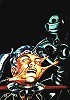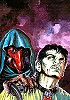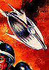Zwei Raumfahrer, einer davon verwundet, der den Arm in der Schlinge trägt, vor gelandetem Raumboot, siehe auch