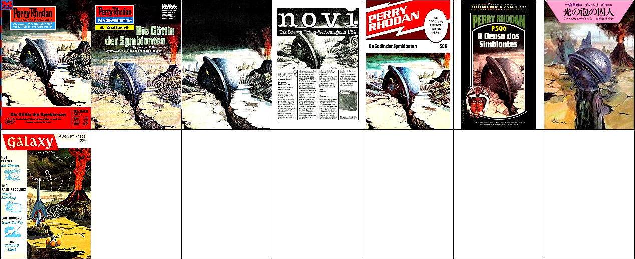 Ähnliches Motiv, 3 - 4 gleiches Bild, 5 und 6 gleiches Bild mit überarbeitetem Hintergrund, 8 von 9 für deutsche Ausgabe des gleichen Romans nachempfunden |