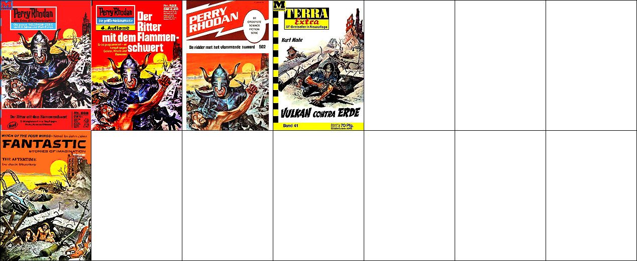 1 - 6 gleiches Bild, 4 s/w, 7 Motiv für japanische Ausgabe nachgezeichnet, 8 ist das Vorbild für den Hintergrund von 1 mit Vulkan, Himmel und Boden mit Rissen |
