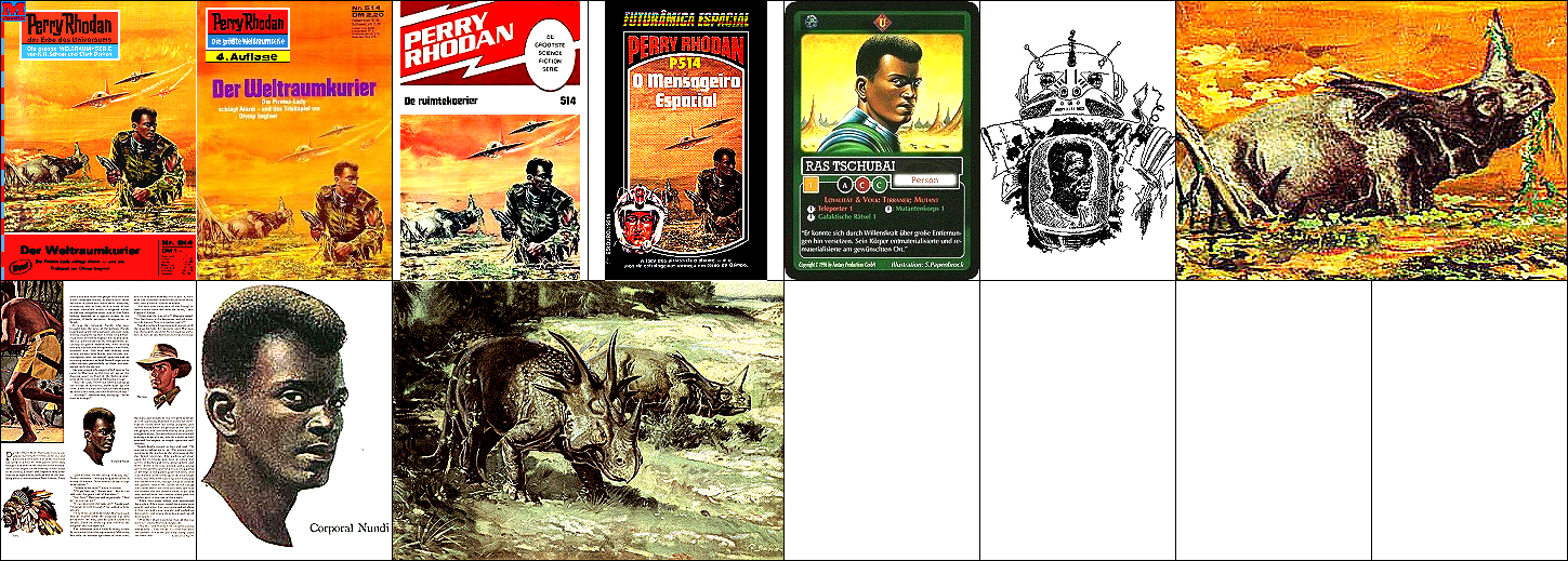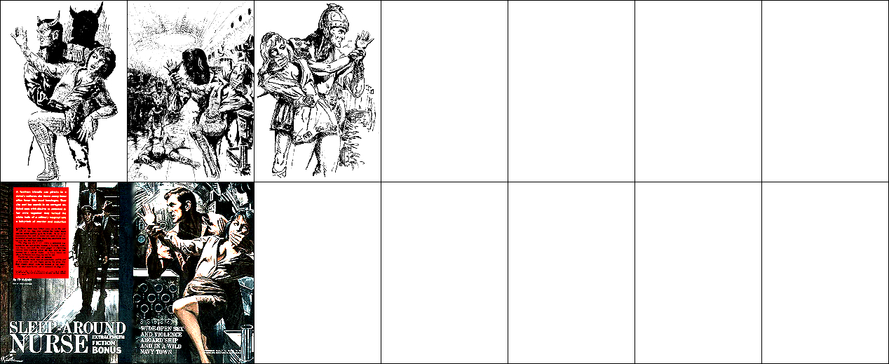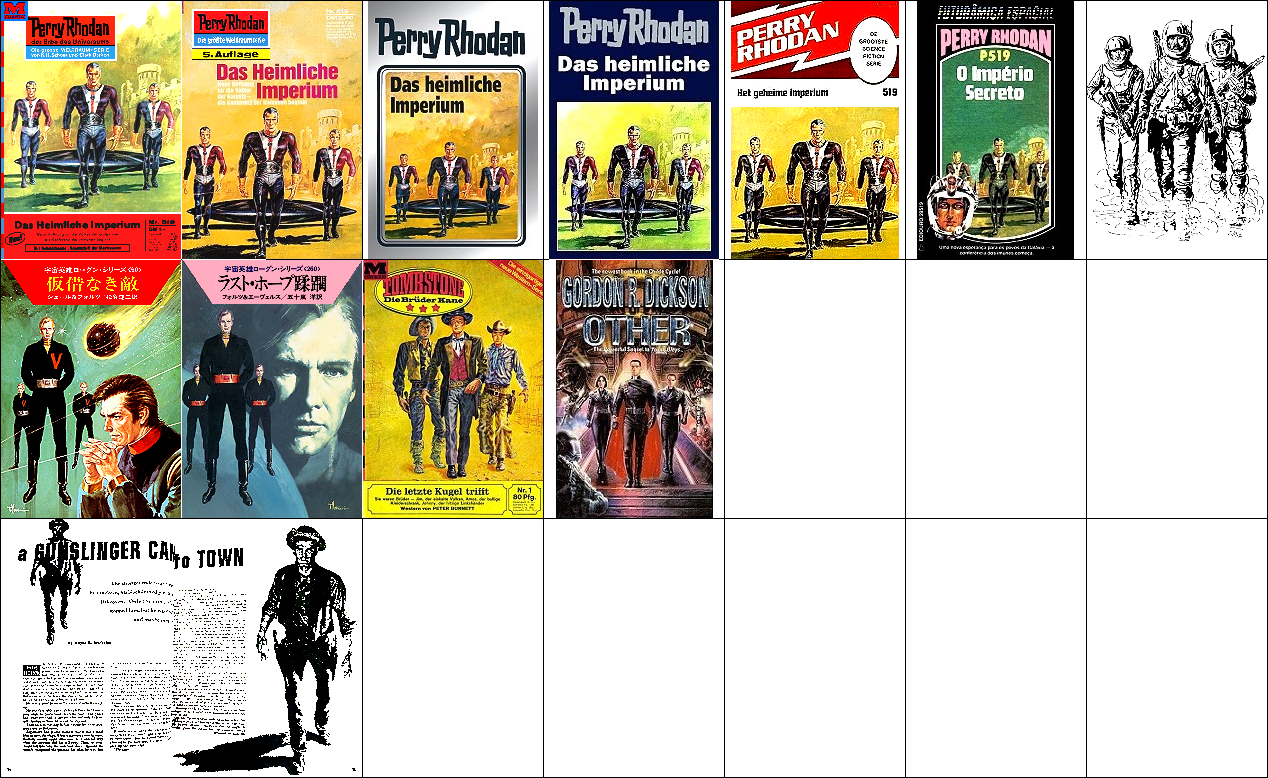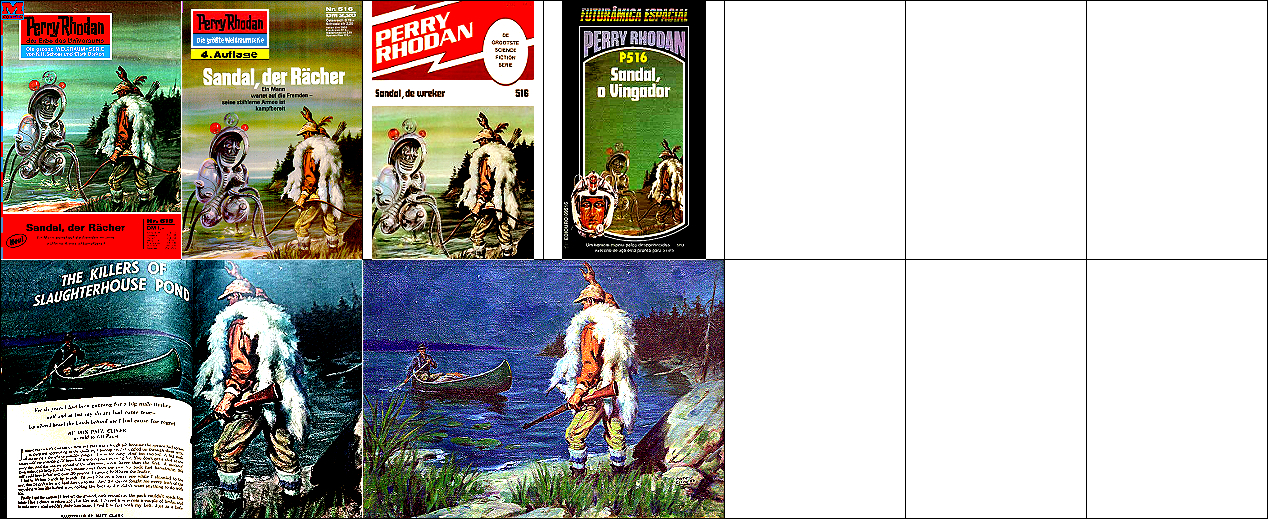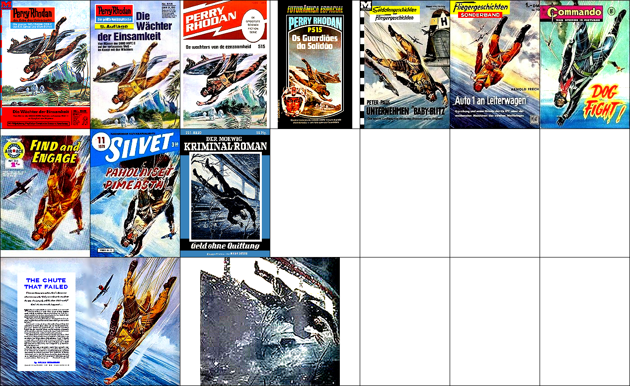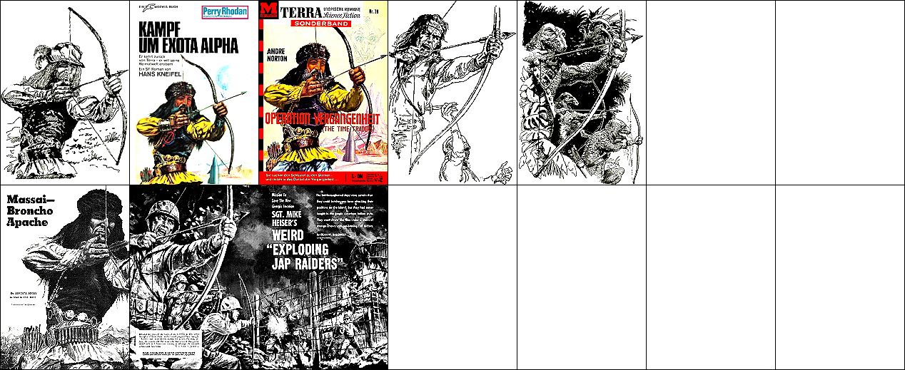 1 - 6 gleiches Bild, 6 Hintergrund überarbeitet (grün eingefärbt), 8 und 9 Neuinterpretationen für japanische Ausgabe,weitere ähnliches Motiv, 15 könnte das für den Mann in1 sein (man beachte die Beinhaltung) |