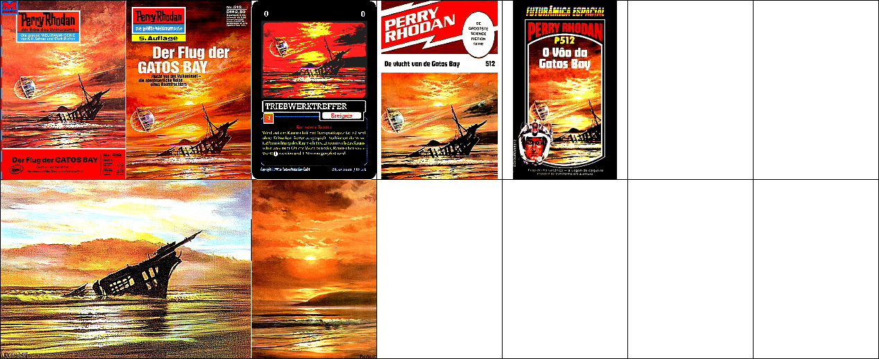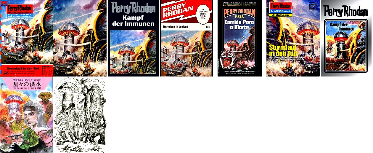 sehr ähnliches Motiv, 1 - 6 gleiches Bild, 6 seitenverkehrt, 7 für Hardcoverausgabe, 8 für japanische Aus- gabe nachgezeichnet |