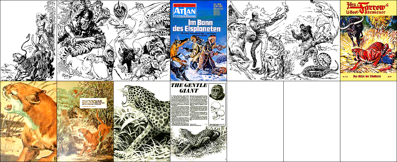 1 - 4 gleiches Bild, 5 und 6 Mann sehr ähnlich, von 8 bzw. 9 nachgezeichnet, der Saurier ist von 10 nachgezeichnet |