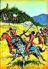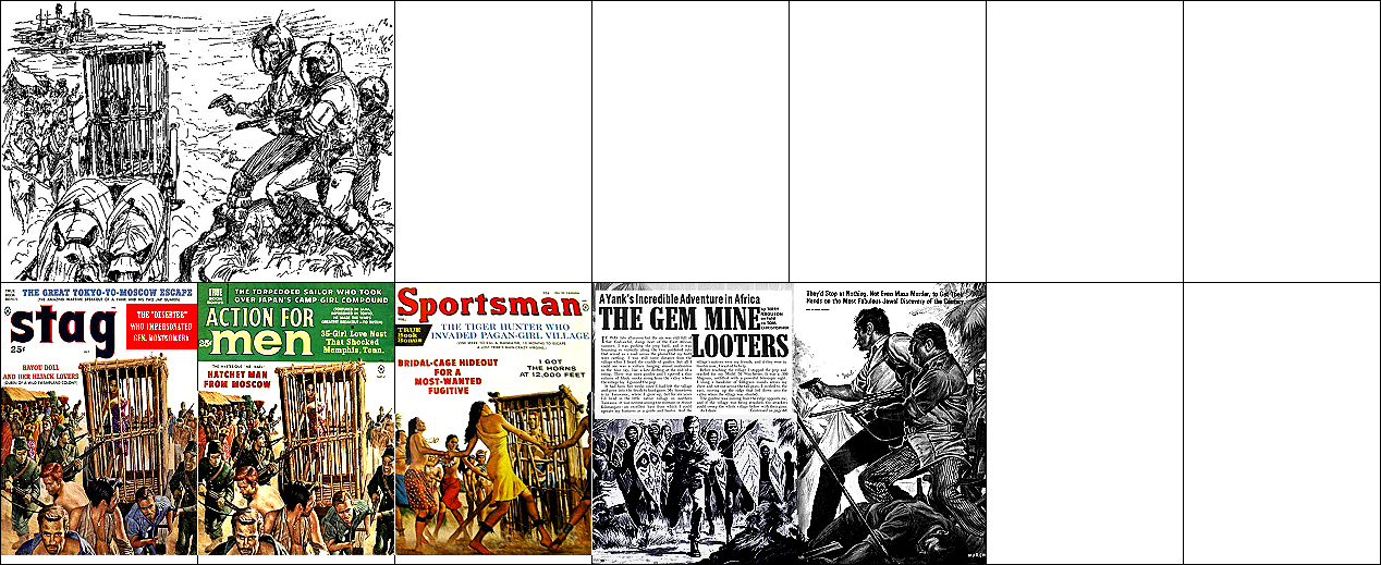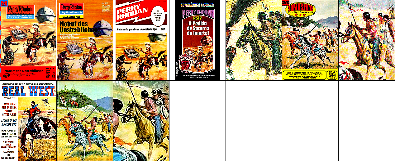 1 - 4 gleiches Bild, 4 mit leicht bearbeitetem Hintergrund, die Indianergruppe rechts kommt auch in 6 vor, 8 Vorbild für den Indianer mit dem sich aufbäumenden Pferd, 9 für die Indianergruppe, wobei 6 fast ein 1:1-Plagiat dieses Bildes ist |